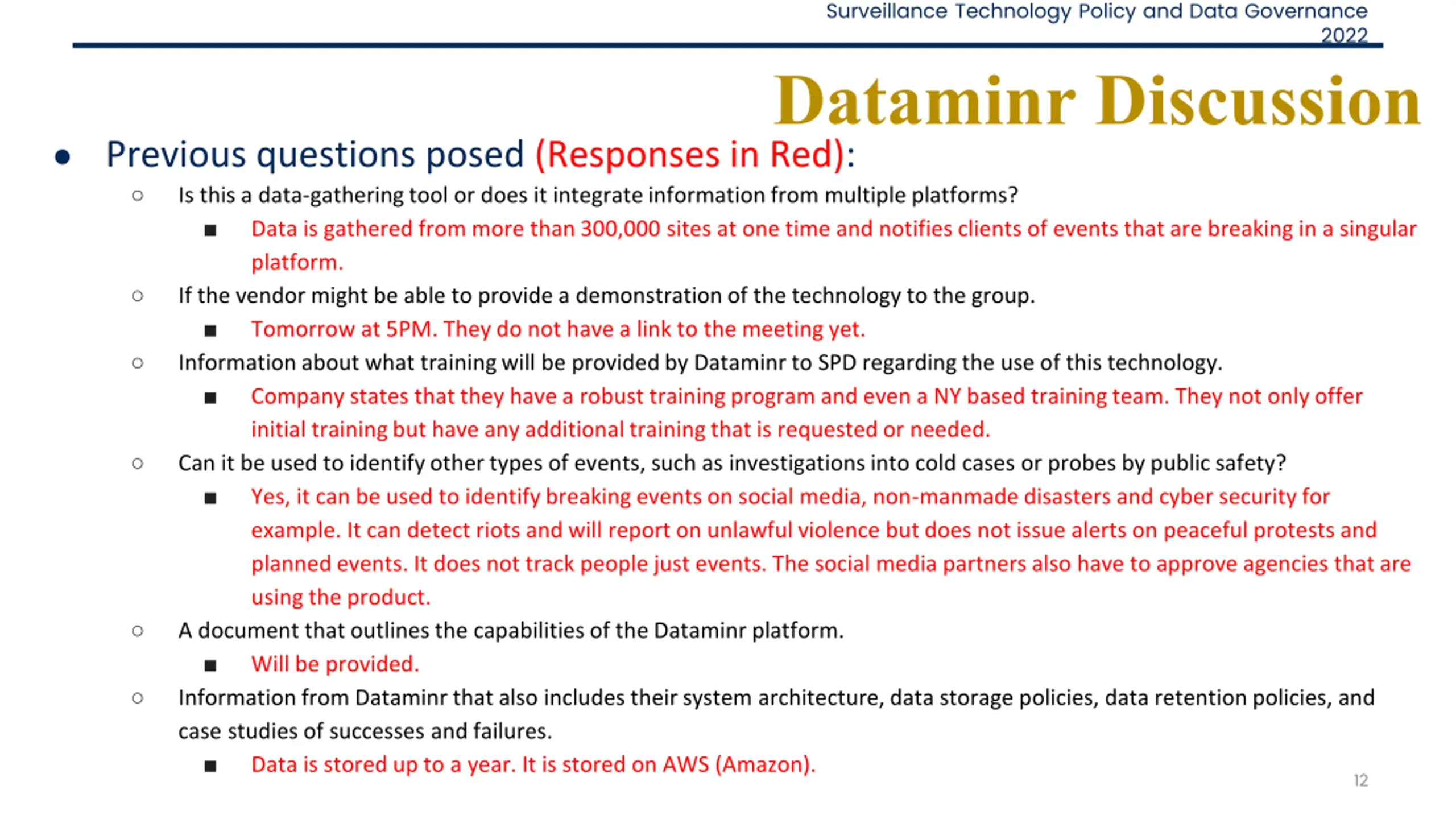 Surveillance Technology Policy and Data Governance Dataminr Discussion 2022 Previous questions posed (Responses in Red): Is this a data-gathering tool or does it integrate information from multiple platforms? Data is gathered from more than 300,000 sites at one time and notifies clients of events that are breaking in a singular platform. If the vendor might be able to provide a demonstration of the technology to the group. Tomorrow at 5PM. They do not have a link to the meeting yet. Information about what training will be provided by Dataminr to SPD regarding the use of this technology. Company states that they have a robust training program and even a NY based training team. They not only offer initial training but have any additional training that is requested or needed. Can it be used to identify other types of events, such as investigations into cold cases or probes by public safety? Yes, it can be used to identify breaking events on social media, non-manmade disasters and cyber security for example. It can detect riots and will report on unlawful violence but does not issue alerts on peaceful protests and planned events. It does not track people just events. The social media partners also have to approve agencies that are using the product. A document that outlines the capabilities of the Dataminr platform. Will be provided. Information from Dataminr that also includes their system architecture, data storage policies, data retention policies, and case studies of successes and failures. Data is stored up to a year. It is stored on AWS (Amazon). 12