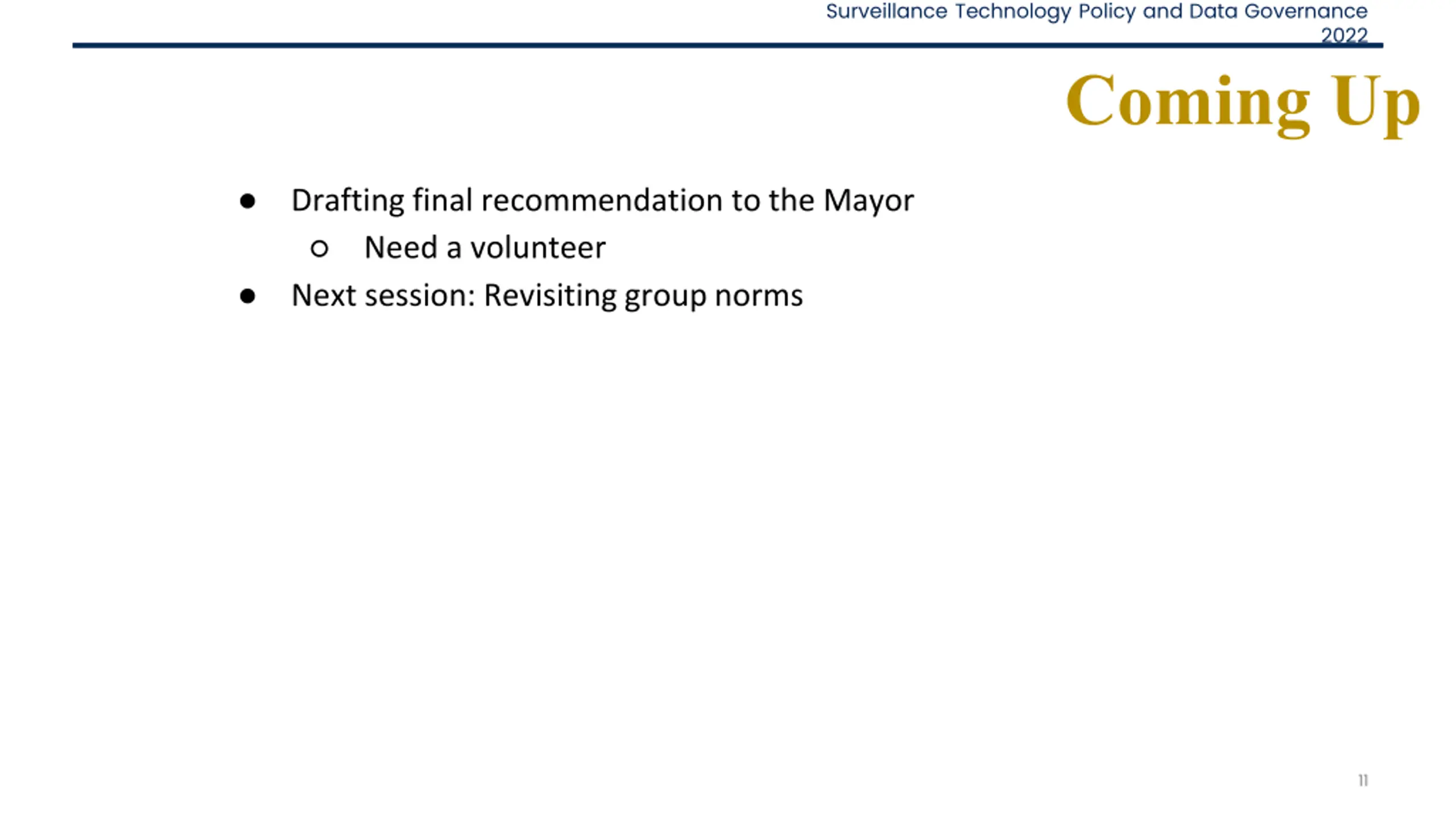 Surveillance Technology Policy and Data Governance Coming Up 2022 Drafting final recommendation to the Mayor Need a volunteer Next session: Revisiting group norms 11