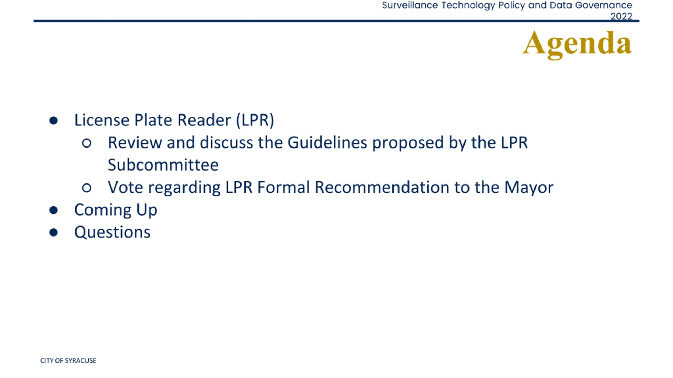 Surveillance Technology Policy and Data Governance 2022 Agenda License Plate Reader (LPR) Review and discuss the Guidelines proposed by the LPR Subcommittee Vote regarding LPR Formal Recommendation to the Mayor Coming Up Questions CITY OF SYRACUSE