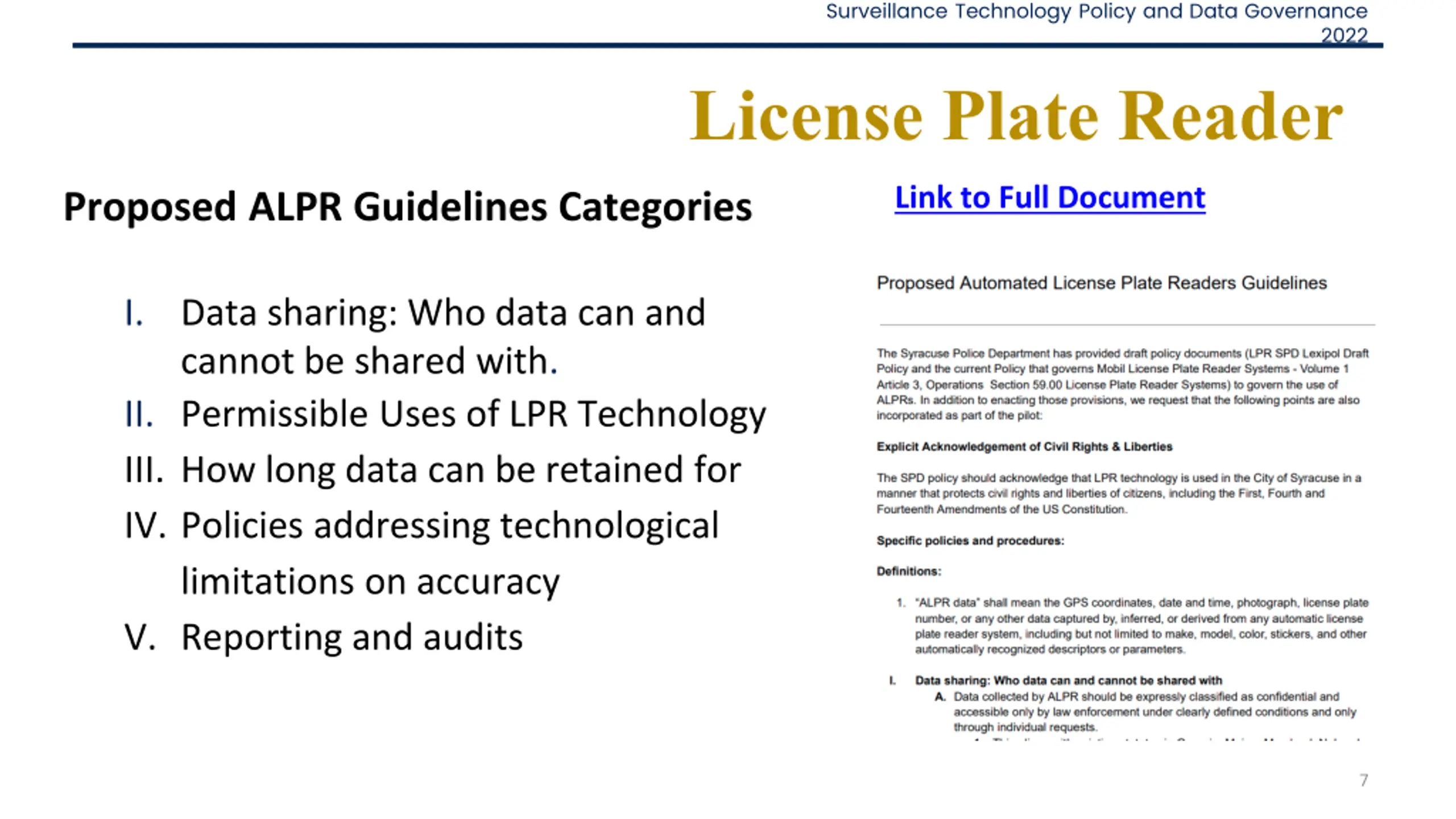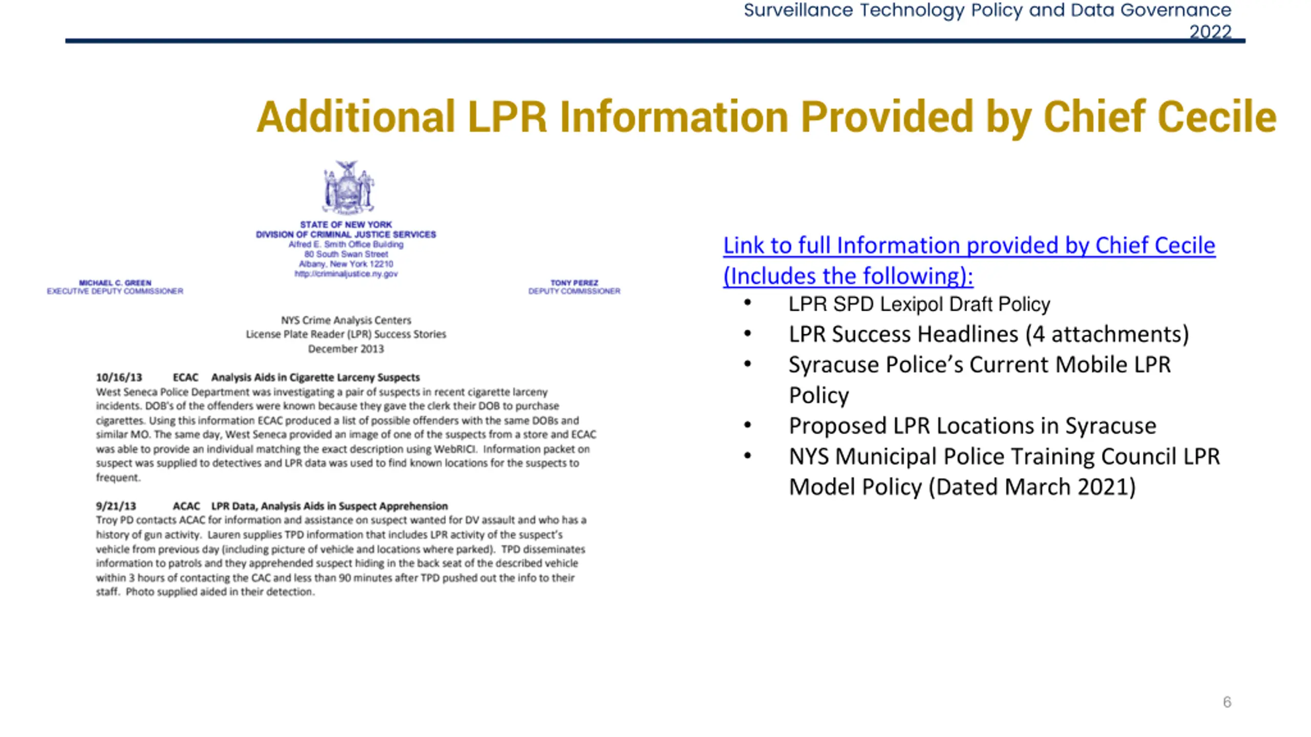 Surveillance Technology Policy and Data Governance 2022 Additional LPR Information Provided by Chief Cecile Link to full Information provided by Chief Cecile (Includes the following): LPR SPD Lexipol Draft Policy LPR Success Headlines (4 attachments) Syracuse Police s Current Mobile LPR Policy Proposed LPR Locations in Syracuse NYS Municipal Police Training Council LPR Model Policy (Dated March 2021) 6