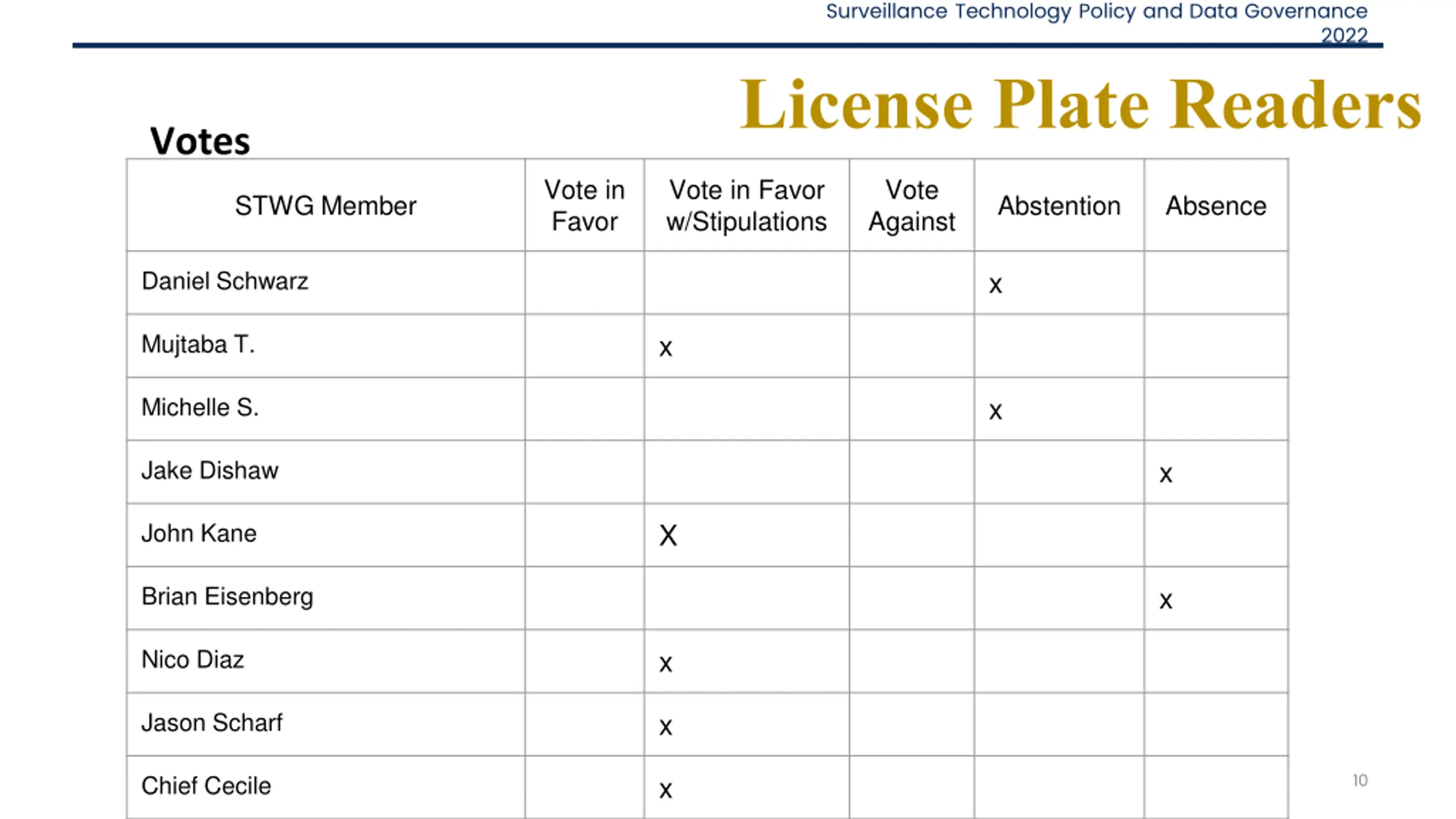 Surveillance Technology Policy and Data Governance 2022 License Plate Readers Votes Vote in Favor Vote in Favor w/Stipulations Vote Against STWG Member Abstention Absence x Daniel Schwarz x Mujtaba T. x Michelle S. x Jake Dishaw X John Kane x Brian Eisenberg x Nico Diaz x Jason Scharf 10 x Chief Cecile