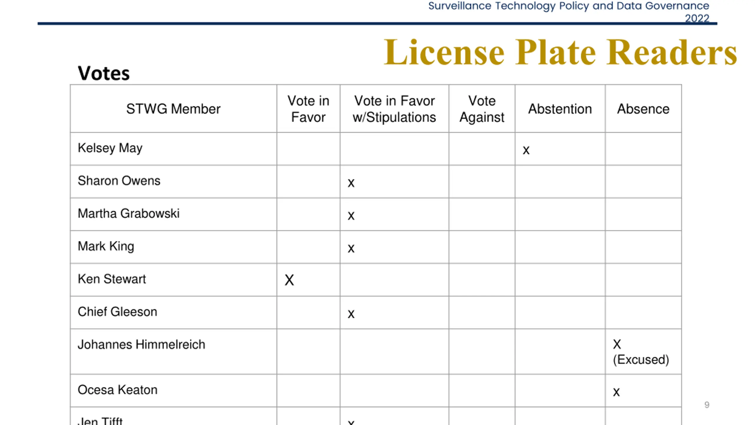 Surveillance Technology Policy and Data Governance License Plate Readers 2022 Votes Vote in Favor Vote in Favor w/Stipulations Vote Against STWG Member Abstention Absence x Kelsey May x Sharon Owens x Martha Grabowski x Mark King X Ken Stewart x Chief Gleeson Johannes Himmelreich X (Excused) x Ocesa Keaton 9 x Jen Tifft