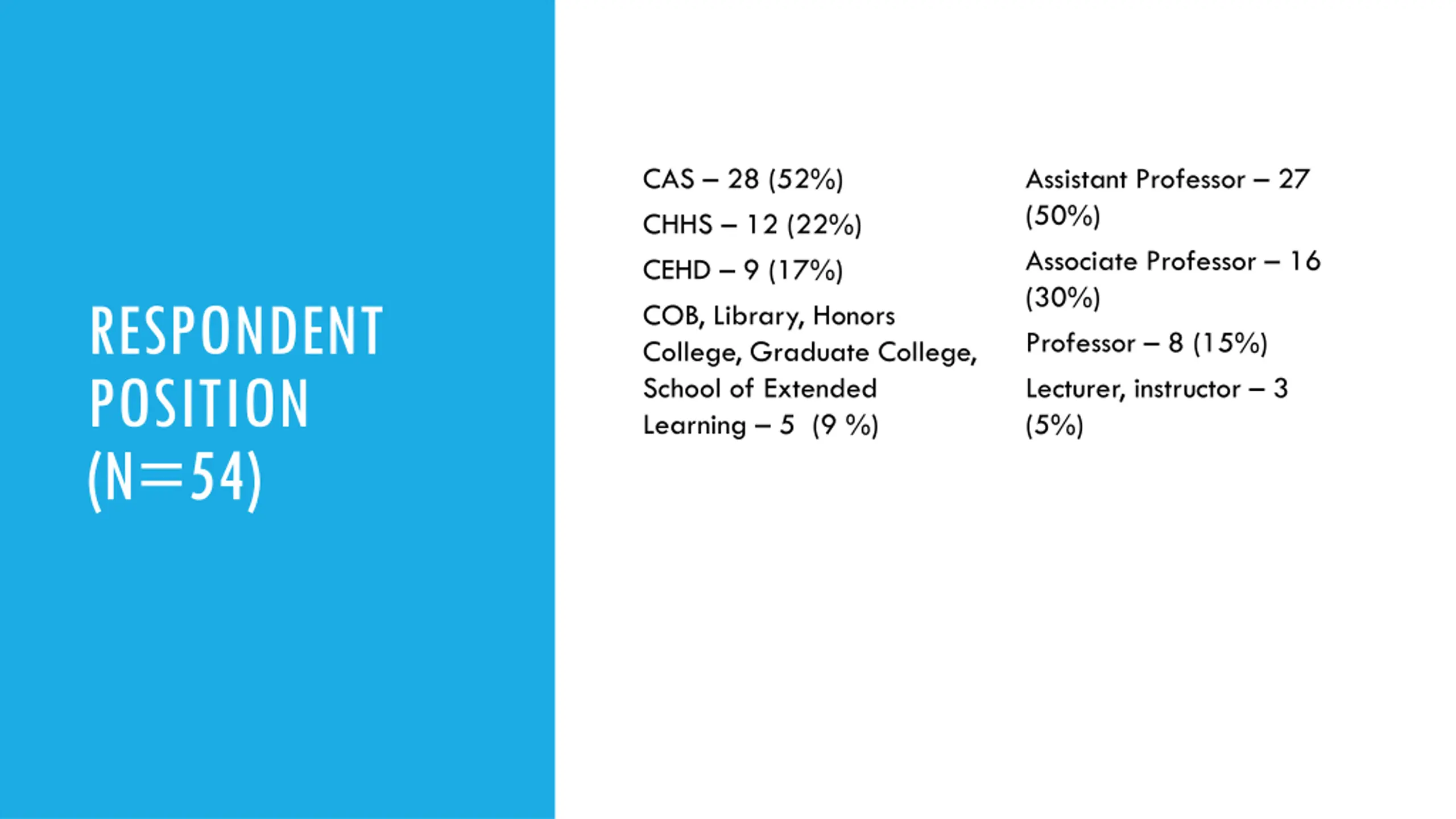 CAS 28 (52%) CHHS 12 (22%) CEHD 9 (17%) COB, Library, Honors College, Graduate College, School of Extended Learning 5 (9 %) Assistant Professor 27 (50%) Associate Professor 16 (30%) Professor 8 (15%) Lecturer, instructor 3 (5%) RESPONDENT POSITION (N=54)