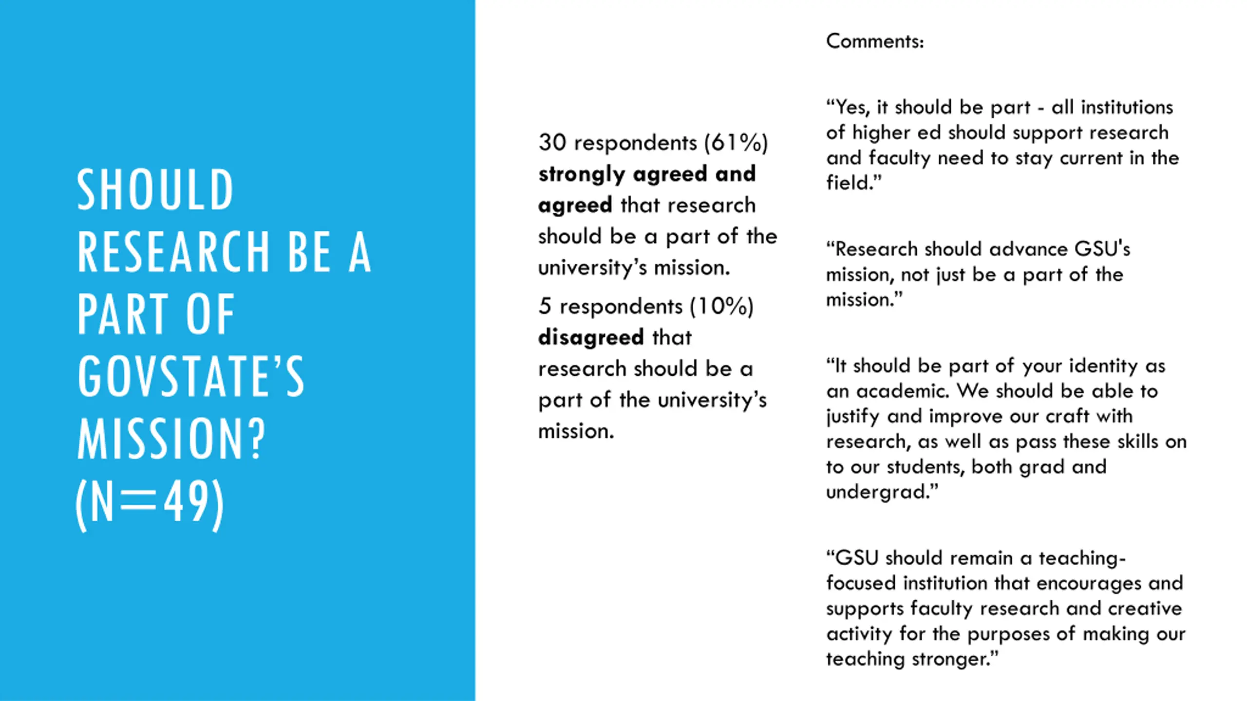 Comments: Yes, it should be part - all institutions of higher ed should support research and faculty need to stay current in the field. 30 respondents (61%) strongly agreed and agreed that research should be a part of the university s mission. 5 respondents (10%) disagreed that research should be a part of the university s mission. SHOULD RESEARCH BE A PART OF GOVSTATE S MISSION? (N=49) Research should advance GSU's mission, not just be a part of the mission. It should be part of your identity as an academic. We should be able to justify and improve our craft with research, as well as pass these skills on to our students, both grad and undergrad. GSU should remain a teaching- focused institution that encourages and supports faculty research and creative activity for the purposes of making our teaching stronger.