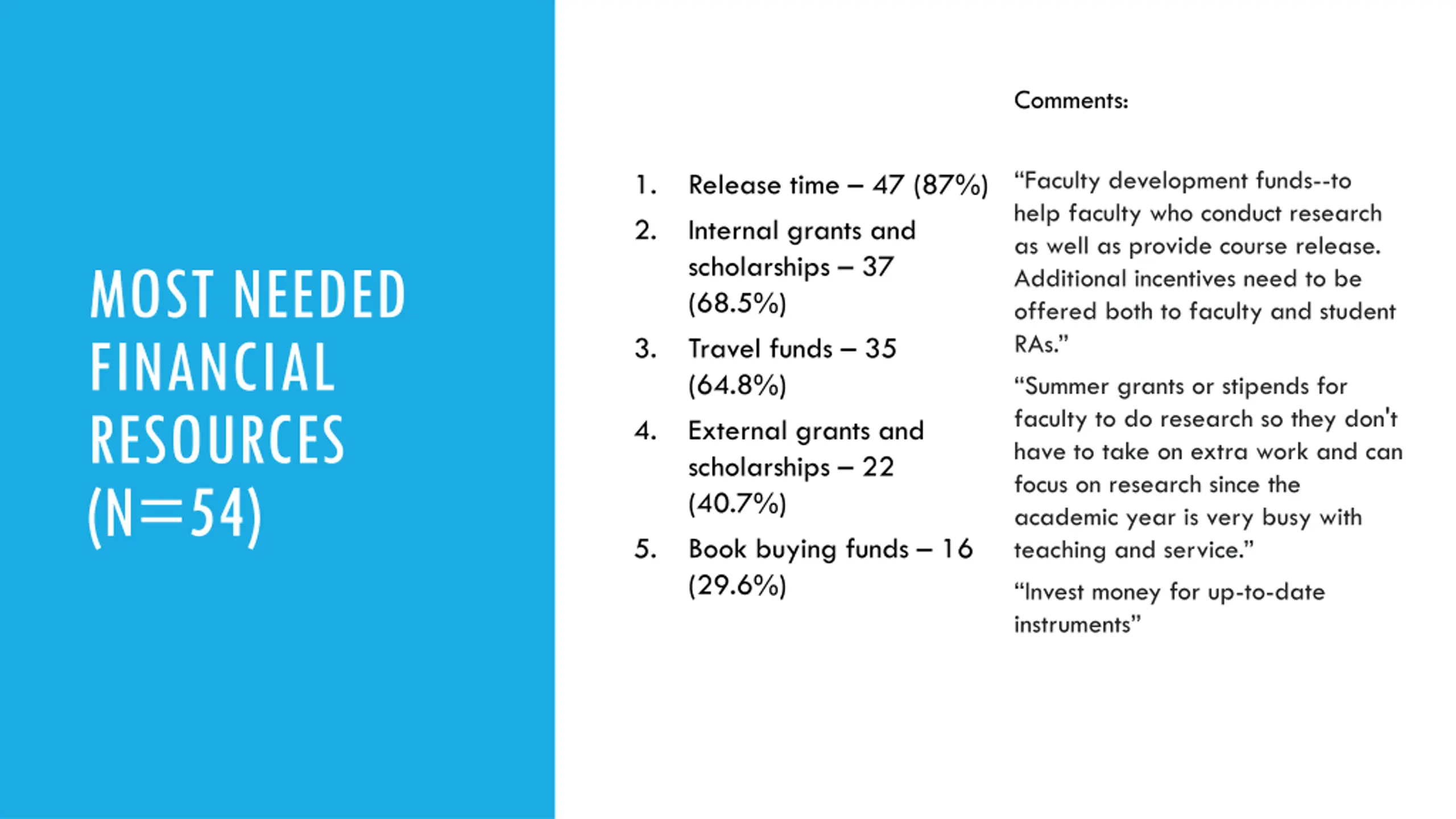 Comments: Faculty development funds--to help faculty who conduct research as well as provide course release. Additional incentives need to be offered both to faculty and student RAs. Summer grants or stipends for faculty to do research so they don't have to take on extra work and can focus on research since the academic year is very busy with teaching and service. Invest money for up-to-date instruments 1. 2. Release time 47 (87%) Internal grants and scholarships 37 (68.5%) Travel funds 35 (64.8%) External grants and scholarships 22 (40.7%) Book buying funds 16 (29.6%) MOST NEEDED FINANCIAL RESOURCES (N=54) 3. 4. 5.