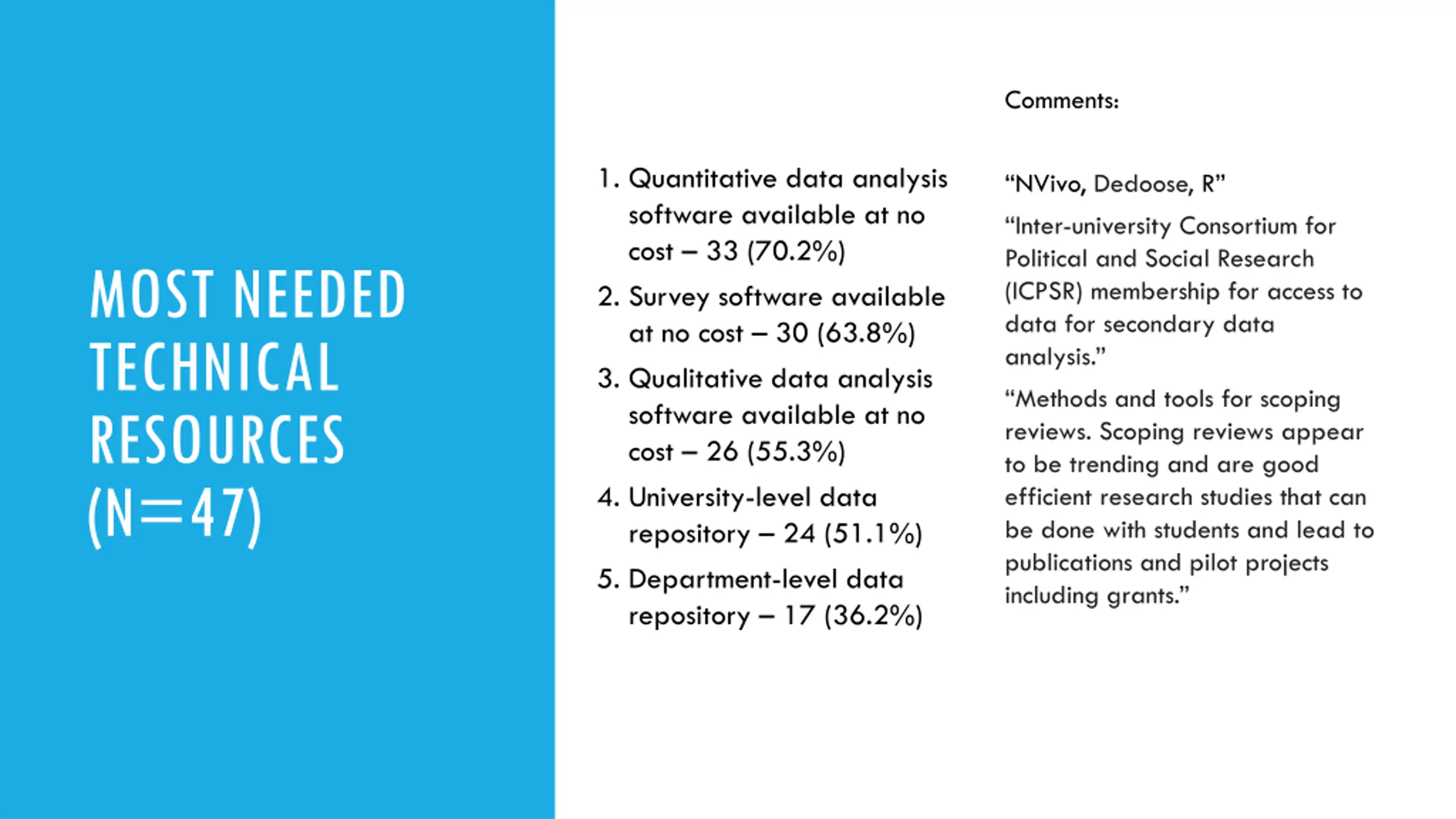Comments: 1. Quantitative data analysis software available at no cost 33 (70.2%) 2. Survey software available at no cost 30 (63.8%) 3. Qualitative data analysis software available at no cost 26 (55.3%) 4. University-level data repository 24 (51.1%) 5. Department-level data repository 17 (36.2%) NVivo, Dedoose, R Inter-university Consortium for Political and Social Research (ICPSR) membership for access to data for secondary data analysis. Methods and tools for scoping reviews. Scoping reviews appear to be trending and are good efficient research studies that can be done with students and lead to publications and pilot projects including grants. MOST NEEDED TECHNICAL RESOURCES (N=47)