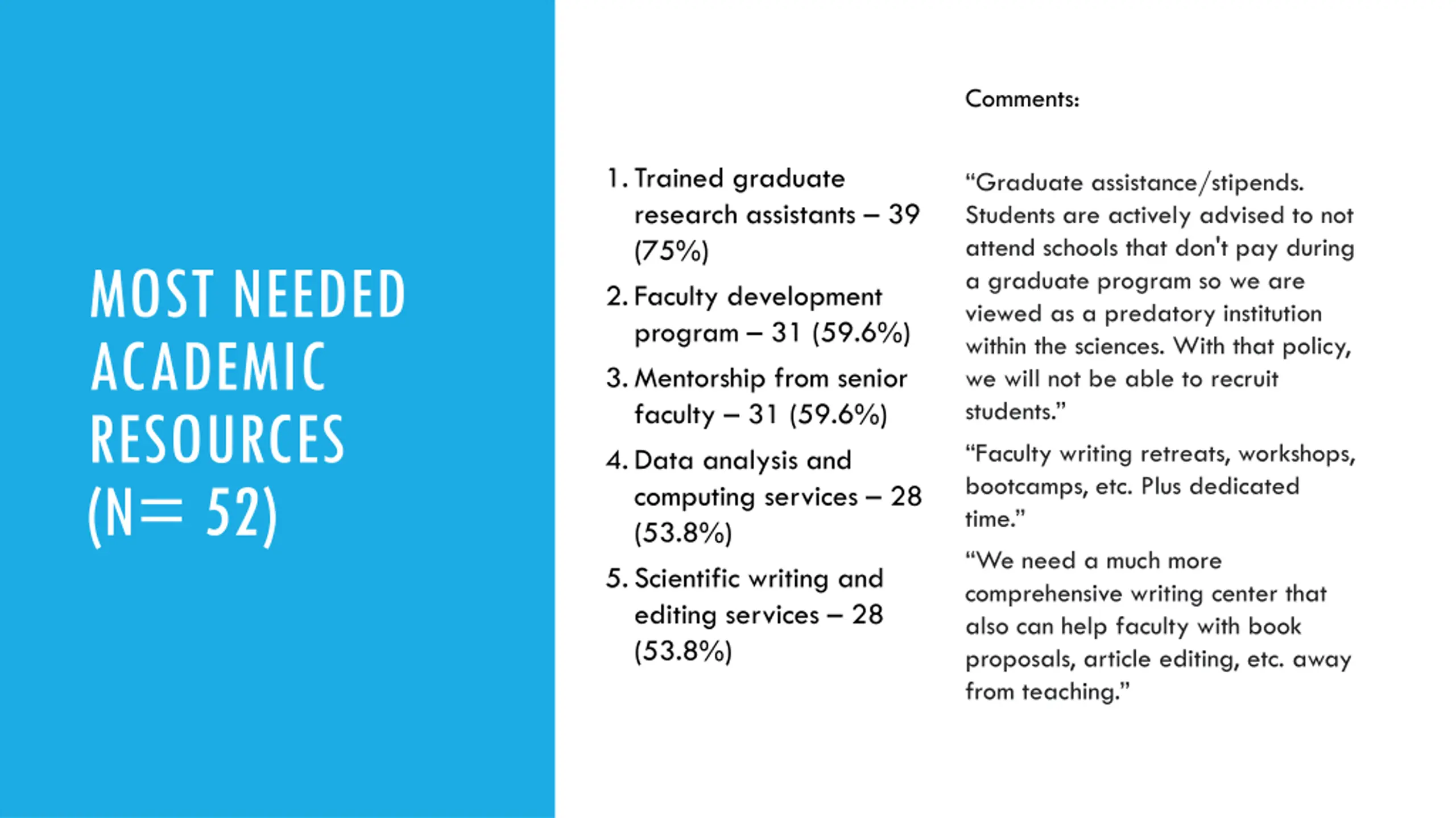 Comments: 1.Trained graduate research assistants 39 (75%) 2.Faculty development program 31 (59.6%) 3.Mentorship from senior faculty 31 (59.6%) 4.Data analysis and computing services 28 (53.8%) 5.Scientific writing and editing services 28 (53.8%) Graduate assistance/stipends. Students are actively advised to not attend schools that don't pay during a graduate program so we are viewed as a predatory institution within the sciences. With that policy, we will not be able to recruit students. Faculty writing retreats, workshops, bootcamps, etc. Plus dedicated time. We need a much more comprehensive writing center that also can help faculty with book proposals, article editing, etc. away from teaching. MOST NEEDED ACADEMIC RESOURCES (N= 52)