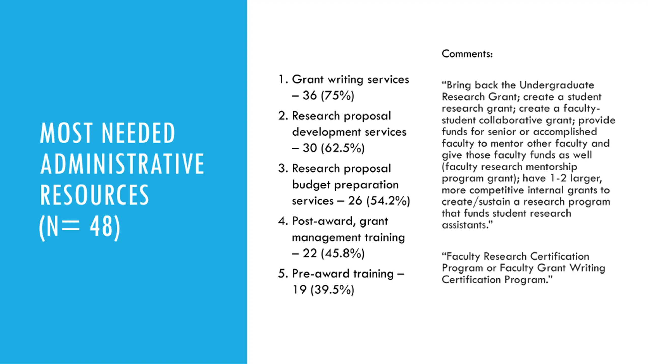 Comments: 1. Grant writing services 36 (75%) 2. Research proposal development services 30 (62.5%) 3. Research proposal budget preparation services 26 (54.2%) 4. Post-award, grant management training 22 (45.8%) 5. Pre-award training 19 (39.5%) Bring back the Undergraduate Research Grant; create a student research grant; create a faculty- student collaborative grant; provide funds for senior or accomplished faculty to mentor other faculty and give those faculty funds as well (faculty research mentorship program grant); have 1-2 larger, more competitive internal grants to create/sustain a research program that funds student research assistants. MOST NEEDED ADMINISTRATIVE RESOURCES (N= 48) Faculty Research Certification Program or Faculty Grant Writing Certification Program.