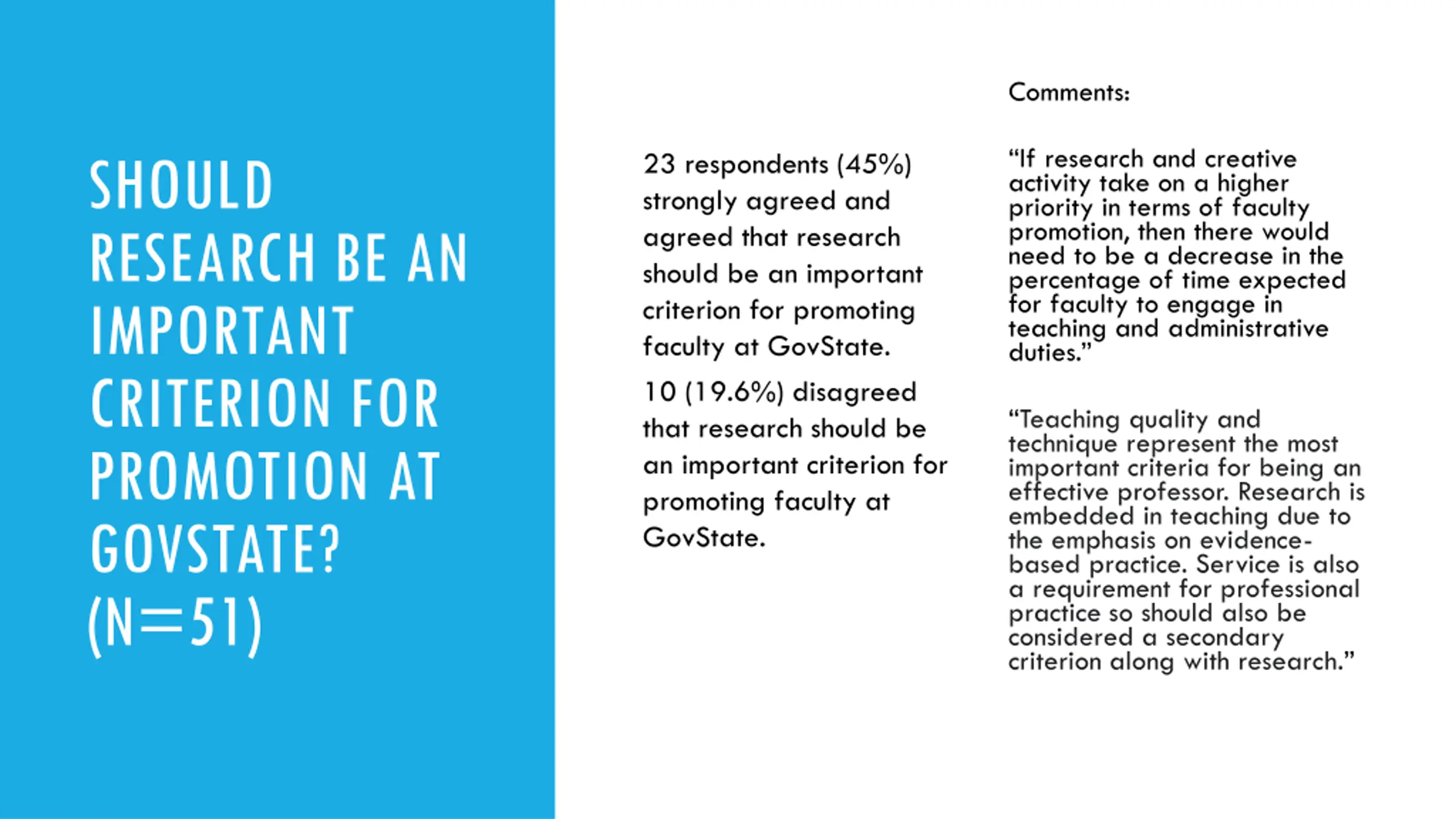 Comments: If research and creative activity take on a higher priority in terms of faculty promotion, then there would need to be a decrease in the percentage of time expected for faculty to engage in teaching and administrative duties. SHOULD RESEARCH BE AN IMPORTANT CRITERION FOR PROMOTION AT GOVSTATE? (N=51) 23 respondents (45%) strongly agreed and agreed that research should be an important criterion for promoting faculty at GovState. 10 (19.6%) disagreed that research should be an important criterion for promoting faculty at GovState. Teaching quality and technique represent the most important criteria for being an effective professor. Research is embedded in teaching due to the emphasis on evidence- based practice. Service is also a requirement for professional practice so should also be considered a secondary criterion along with research.