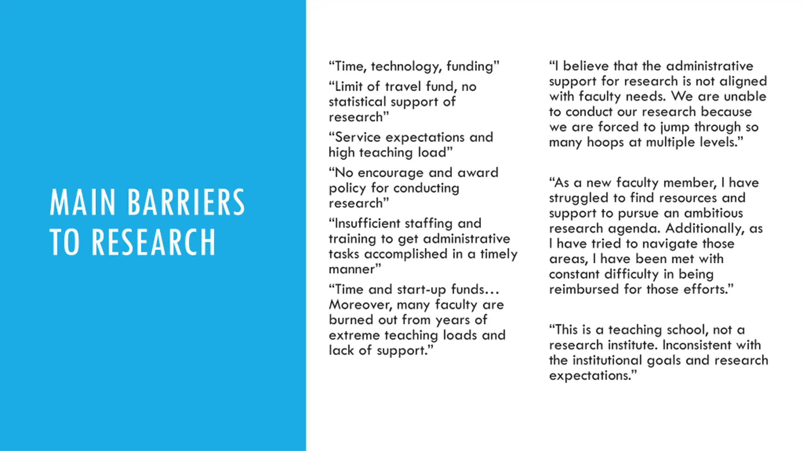 I believe that the administrative support for research is not aligned with faculty needs. We are unable to conduct our research because we are forced to jump through so many hoops at multiple levels. Time, technology, funding Limit of travel fund, no statistical support of research Service expectations and high teaching load No encourage and award policy for conducting research Insufficient staffing and training to get administrative tasks accomplished in a timely manner Time and start-up funds Moreover, many faculty are burned out from years of extreme teaching loads and lack of support. As a new faculty member, I have struggled to find resources and support to pursue an ambitious research agenda. Additionally, as I have tried to navigate those areas, I have been met with constant difficulty in being reimbursed for those efforts. MAIN BARRIERS TO RESEARCH This is a teaching school, not a research institute. Inconsistent with the institutional goals and research expectations.