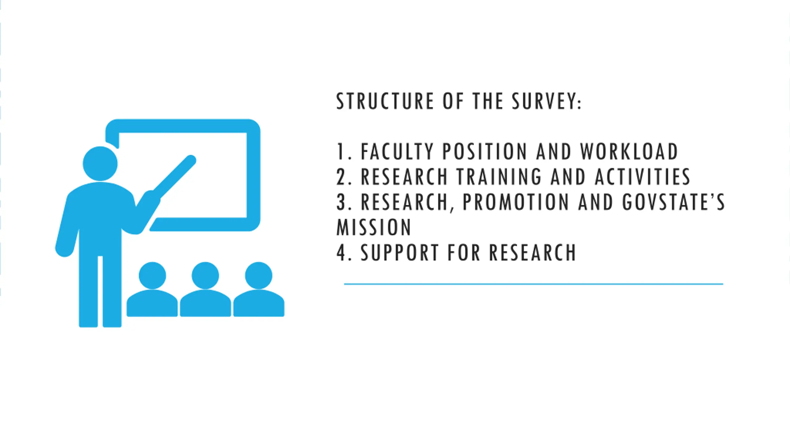 STRUCTURE OF THE SURVEY: 1. FACULTY POSITION AND WORKLOAD 2. RESEARCH TRAINING AND ACTIVITIES 3. RESEARCH, PROMOTION AND GOVSTATE S MISSION 4. SUPPORT FOR RESEARCH