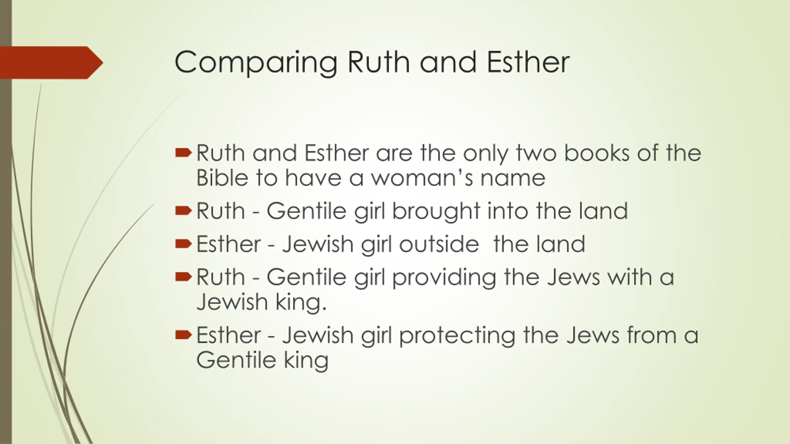 Comparing Ruth and Esther Ruth and Esther are the only two books of the Bible to have a woman s name Ruth - Gentile girl brought into the land Esther - Jewish girl outside the land Ruth - Gentile girl providing the Jews with a Jewish king. Esther - Jewish girl protecting the Jews from a Gentile king