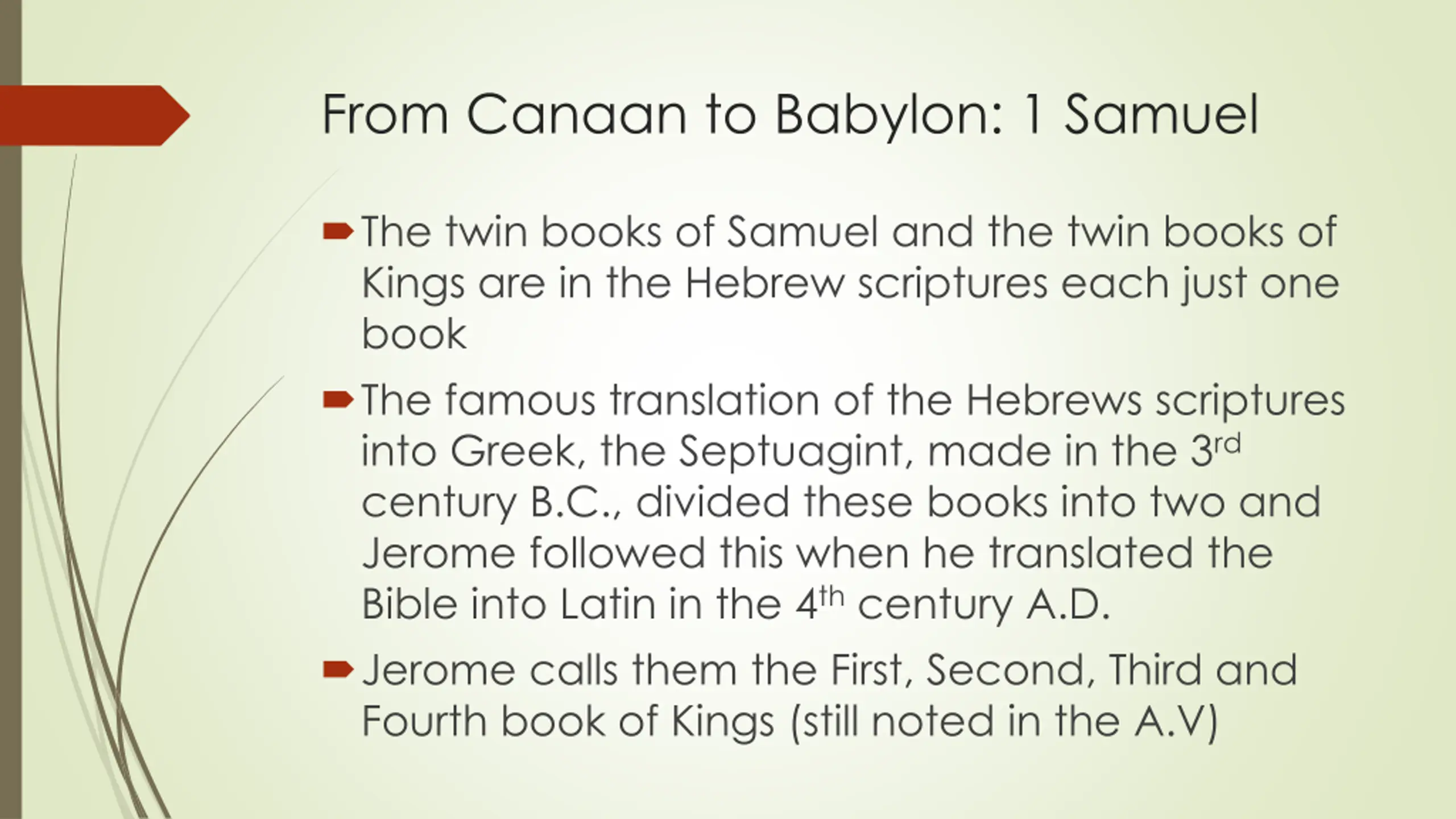From Canaan to Babylon: 1 Samuel The twin books of Samuel and the twin books of Kings are in the Hebrew scriptures each just one book The famous translation of the Hebrews scriptures into Greek, the Septuagint, made in the 3rd century B.C., divided these books into two and Jerome followed this when he translated the Bible into Latin in the 4th century A.D. Jerome calls them the First, Second, Third and Fourth book of Kings (still noted in the A.V)