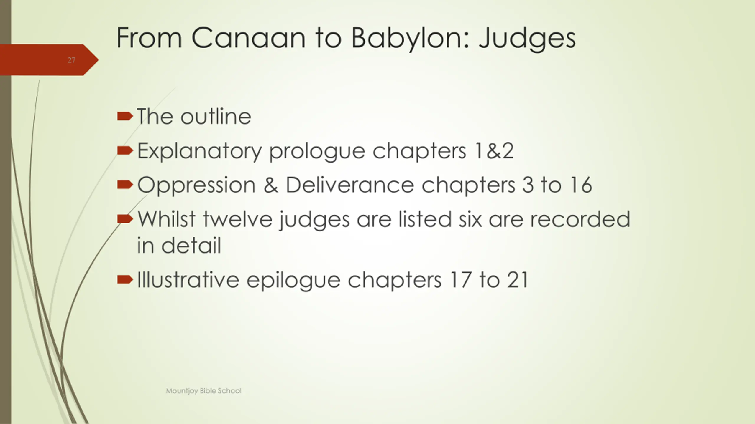 From Canaan to Babylon: Judges 27 The outline Explanatory prologue chapters 1&2 Oppression & Deliverance chapters 3 to 16 Whilst twelve judges are listed six are recorded in detail Illustrative epilogue chapters 17 to 21 Mountjoy Bible School