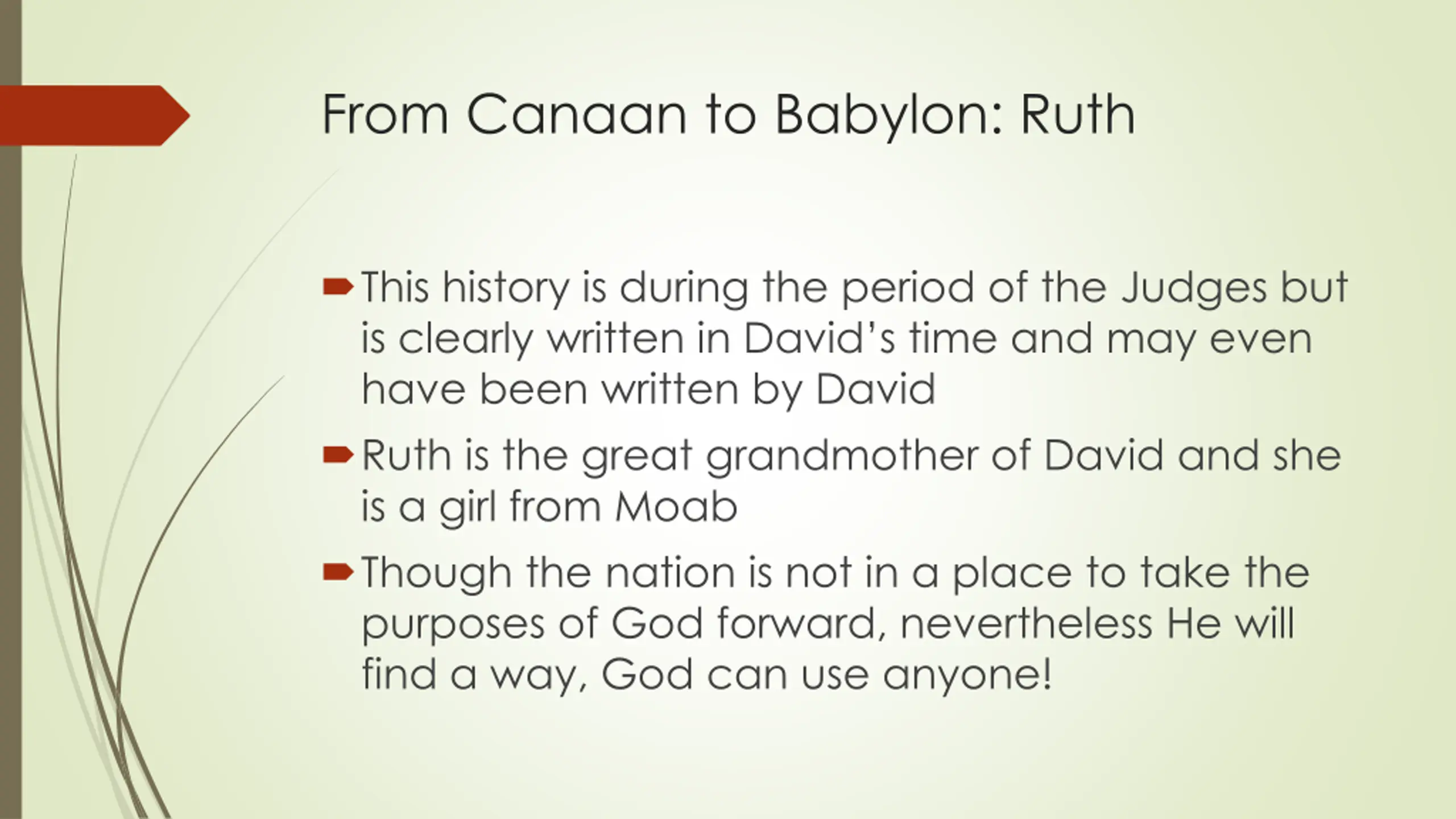 From Canaan to Babylon: Ruth This history is during the period of the Judges but is clearly written in David s time and may even have been written by David Ruth is the great grandmother of David and she is a girl from Moab Though the nation is not in a place to take the purposes of God forward, nevertheless He will find a way, God can use anyone!