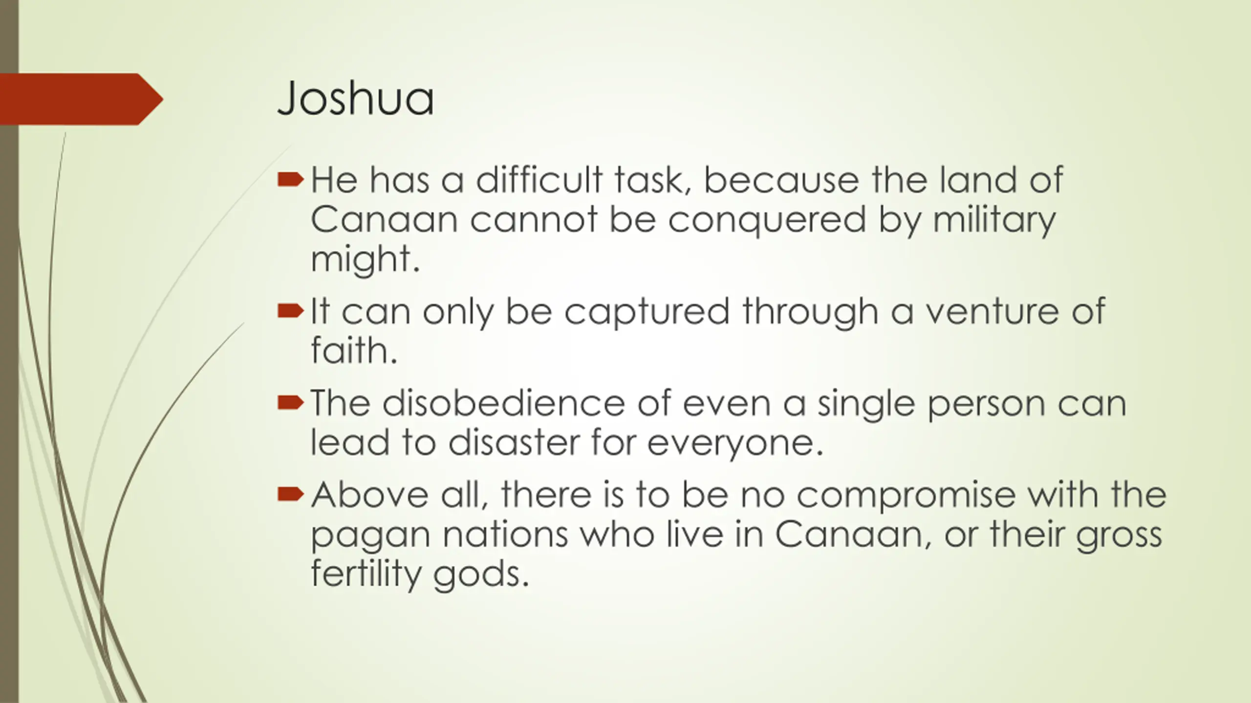 Joshua He has a difficult task, because the land of Canaan cannot be conquered by military might. It can only be captured through a venture of faith. The disobedience of even a single person can lead to disaster for everyone. Above all, there is to be no compromise with the pagan nations who live in Canaan, or their gross fertility gods.