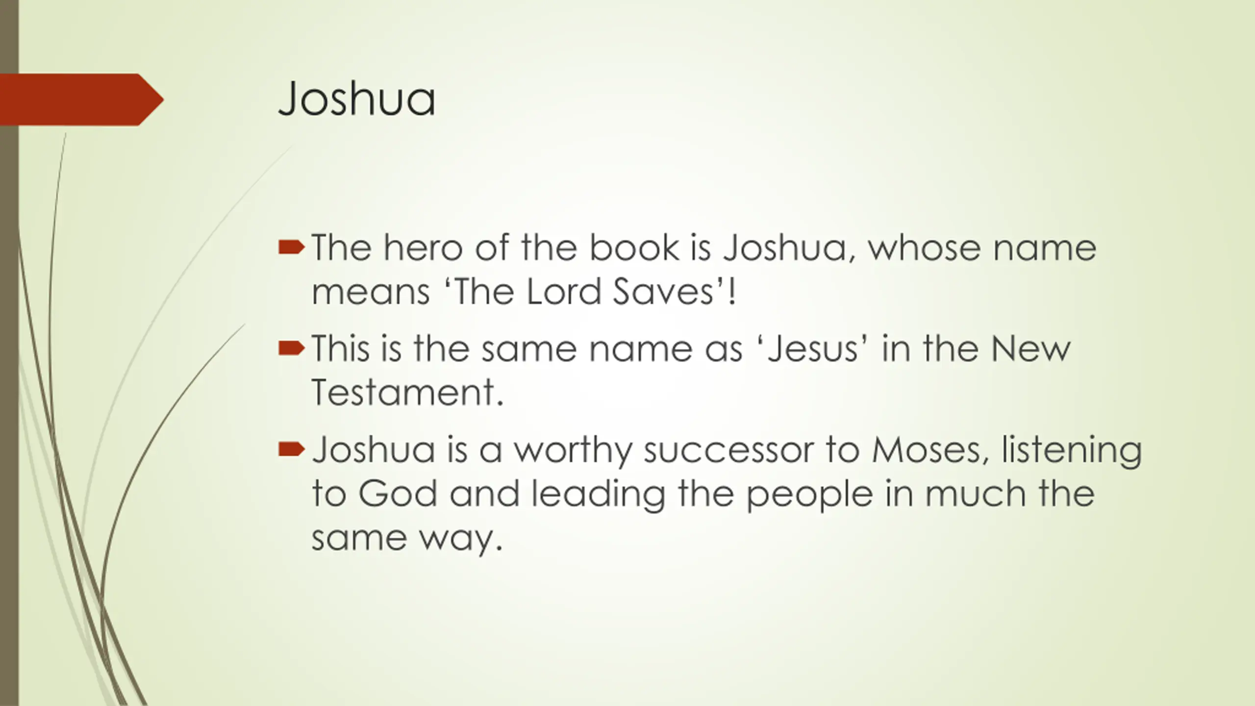 Joshua The hero of the book is Joshua, whose name means The Lord Saves ! This is the same name as Jesus in the New Testament. Joshua is a worthy successor to Moses, listening to God and leading the people in much the same way.