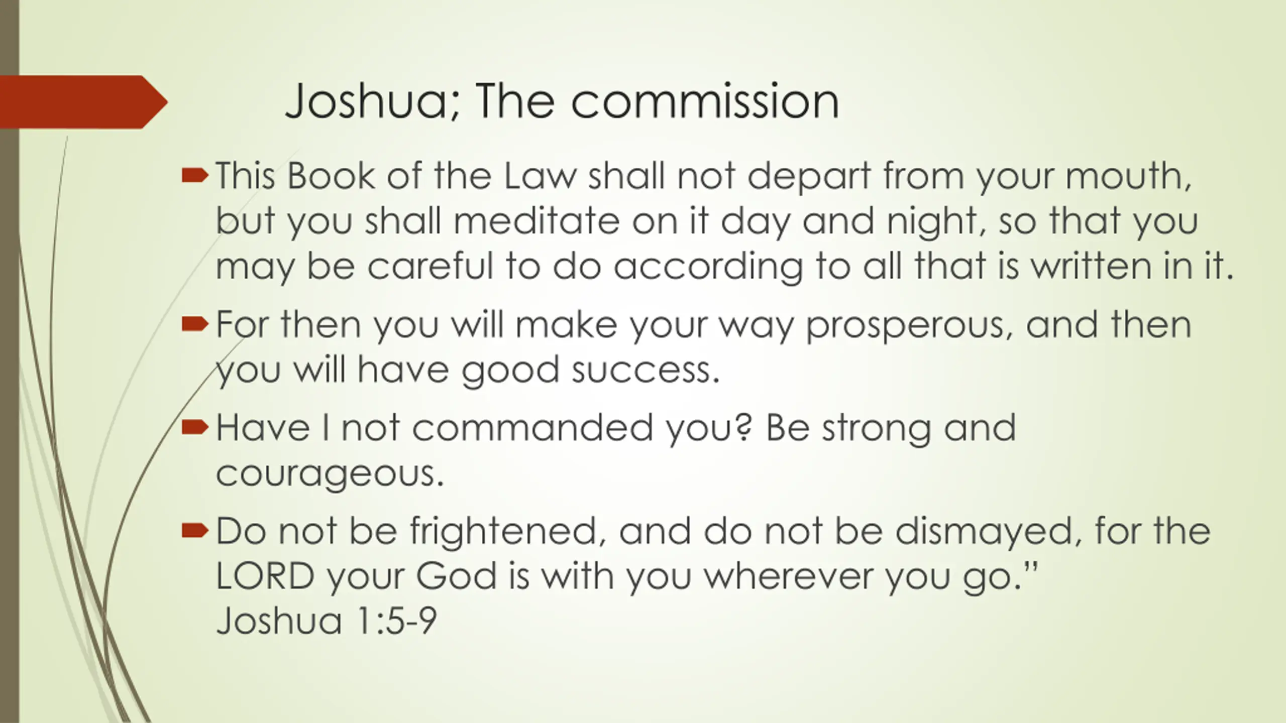 Joshua; The commission This Book of the Law shall not depart from your mouth, but you shall meditate on it day and night, so that you may be careful to do according to all that is written in it. For then you will make your way prosperous, and then you will have good success. Have I not commanded you? Be strong and courageous. Do not be frightened, and do not be dismayed, for the LORD your God is with you wherever you go. Joshua 1:5-9