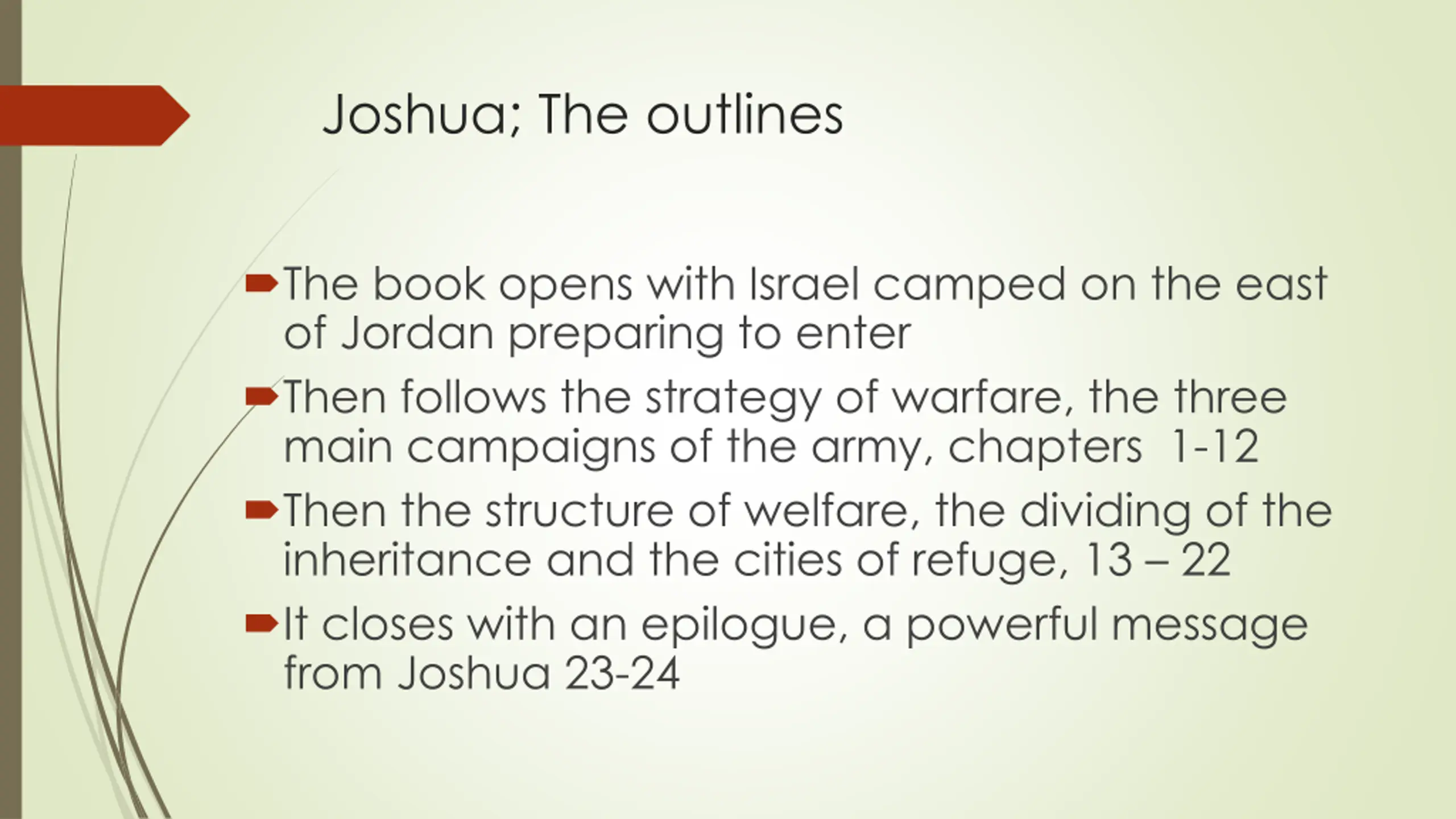 Joshua; The outlines The book opens with Israel camped on the east of Jordan preparing to enter Then follows the strategy of warfare, the three main campaigns of the army, chapters 1-12 Then the structure of welfare, the dividing of the inheritance and the cities of refuge, 13 22 It closes with an epilogue, a powerful message from Joshua 23-24