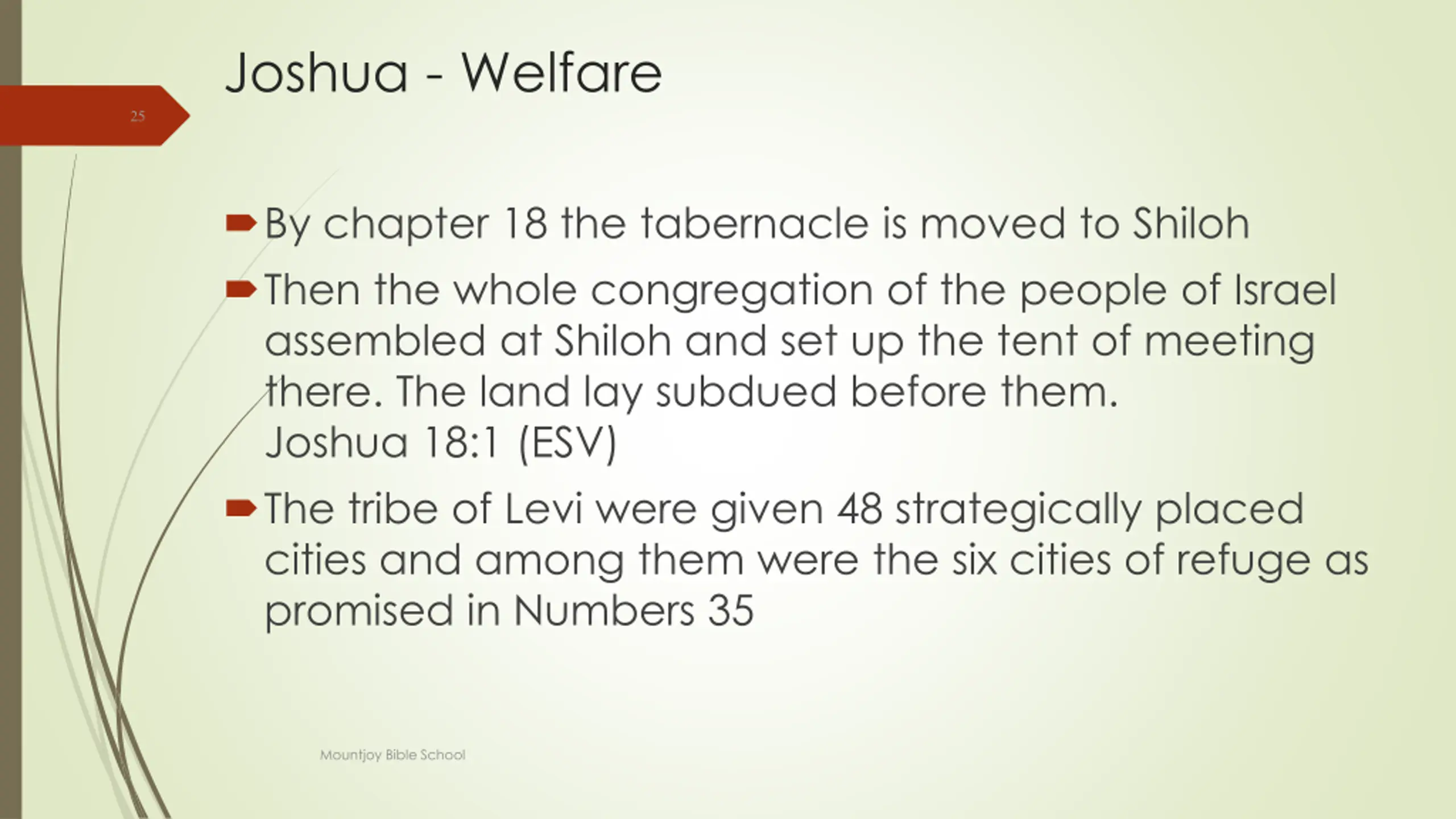 Joshua - Welfare 25 By chapter 18 the tabernacle is moved to Shiloh Then the whole congregation of the people of Israel assembled at Shiloh and set up the tent of meeting there. The land lay subdued before them. Joshua 18:1 (ESV) The tribe of Levi were given 48 strategically placed cities and among them were the six cities of refuge as promised in Numbers 35 Mountjoy Bible School