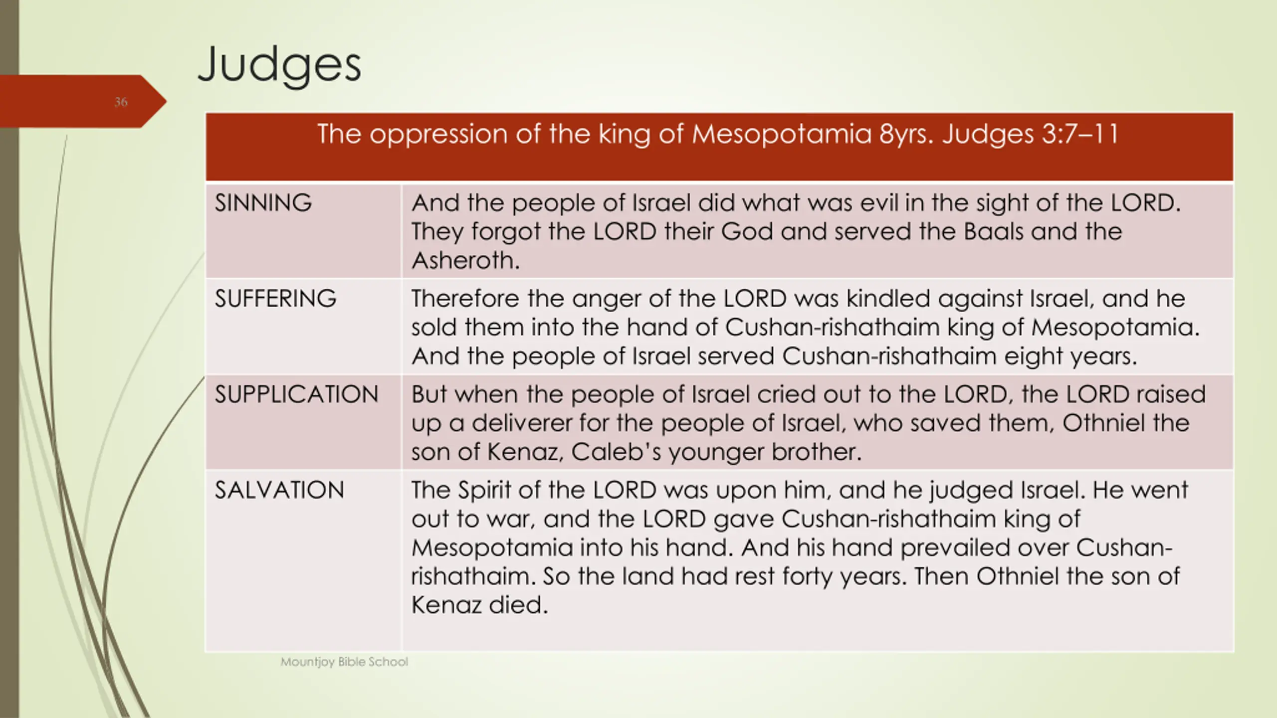Judges 36 The oppression of the king of Mesopotamia 8yrs. Judges 3:7 11 SINNING And the people of Israel did what was evil in the sight of the LORD. They forgot the LORD their God and served the Baals and the Asheroth. Therefore the anger of the LORD was kindled against Israel, and he sold them into the hand of Cushan-rishathaim king of Mesopotamia. And the people of Israel served Cushan-rishathaim eight years. But when the people of Israel cried out to the LORD, the LORD raised up a deliverer for the people of Israel, who saved them, Othniel the son of Kenaz, Caleb s younger brother. The Spirit of the LORD was upon him, and he judged Israel. He went out to war, and the LORD gave Cushan-rishathaim king of Mesopotamia into his hand. And his hand prevailed over Cushan- rishathaim. So the land had rest forty years. Then Othniel the son of Kenaz died. SUFFERING SUPPLICATION SALVATION Mountjoy Bible School