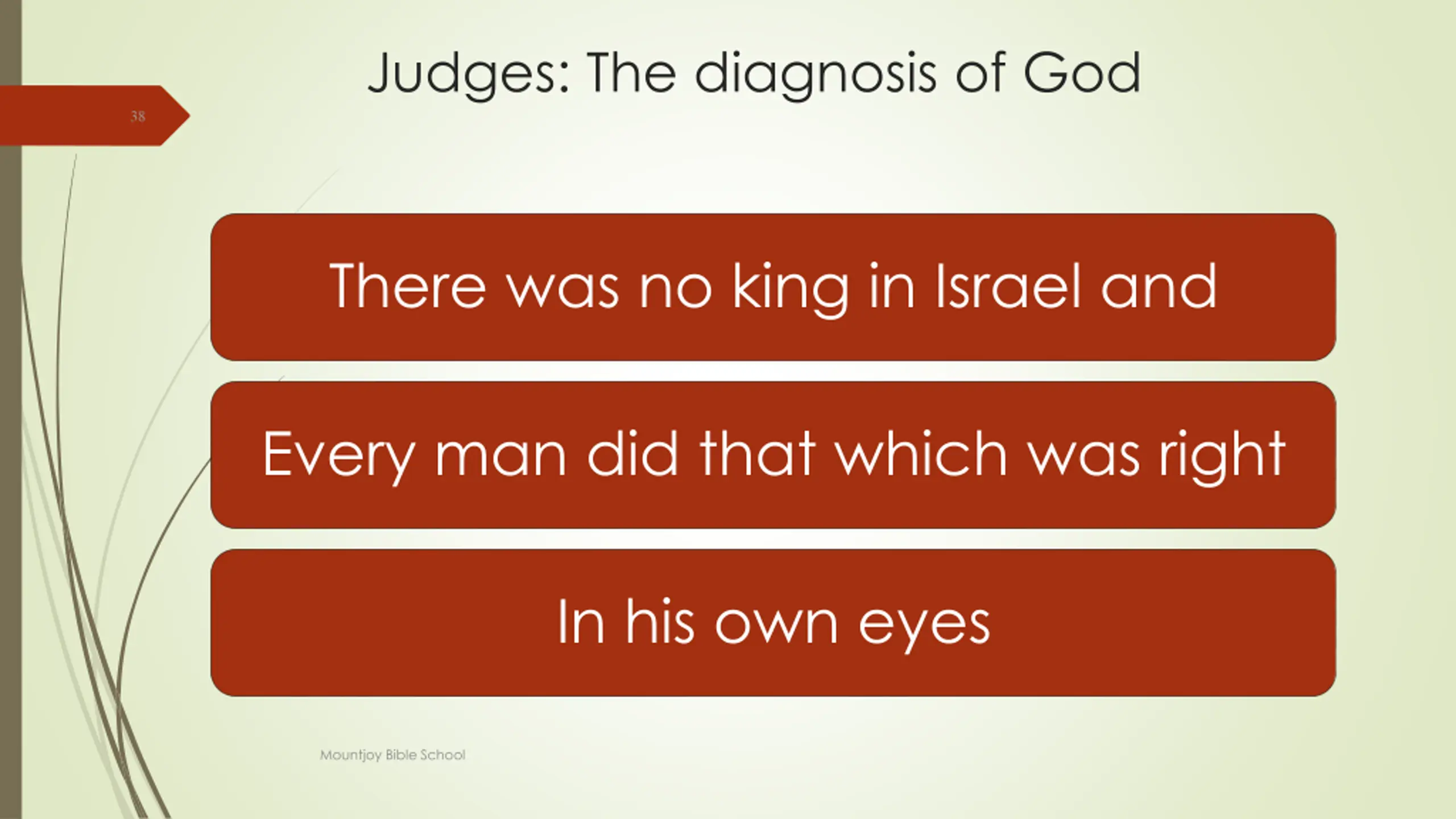 Judges: The diagnosis of God 38 There was no king in Israel and Every man did that which was right In his own eyes Mountjoy Bible School