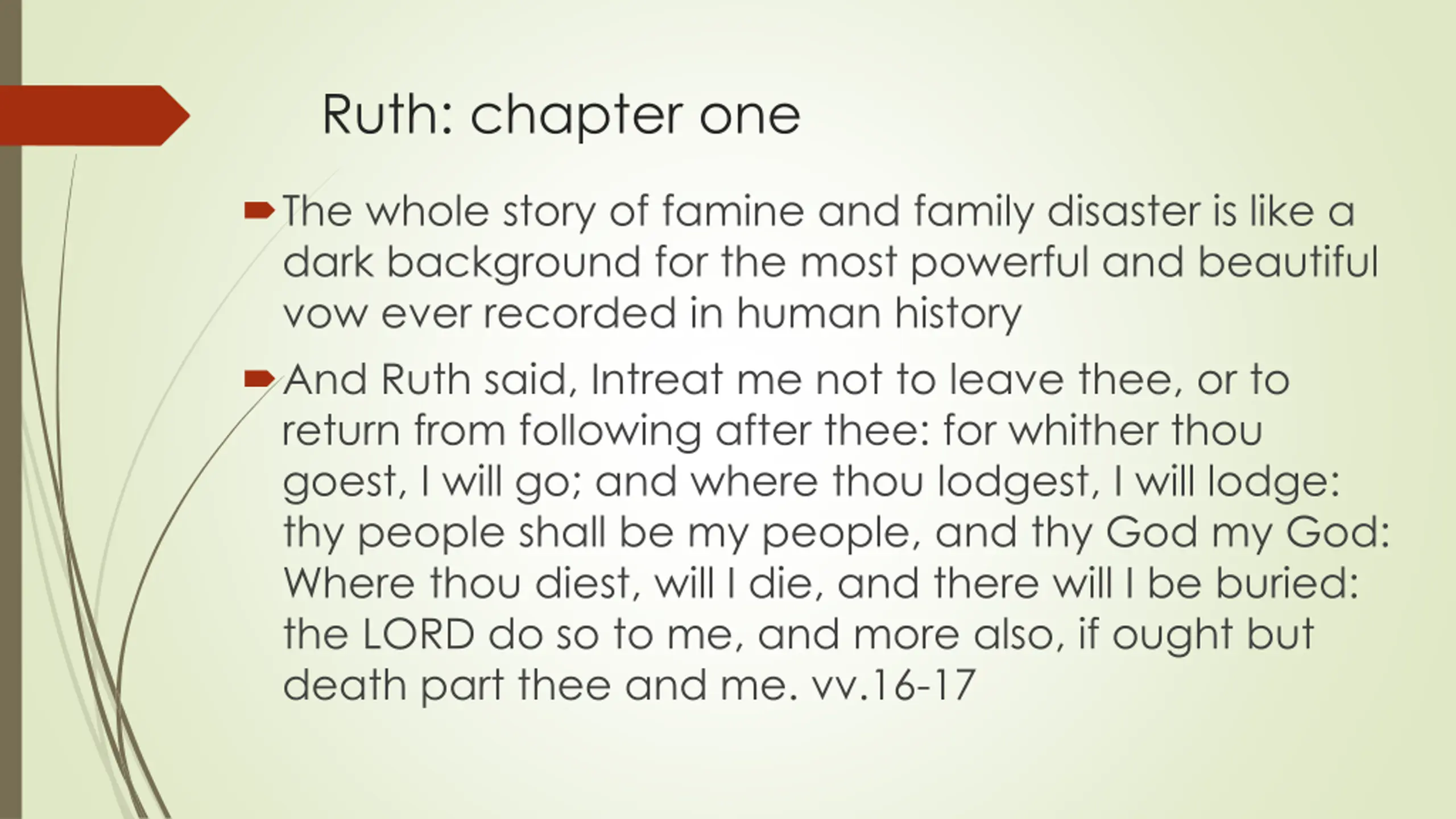 Ruth: chapter one The whole story of famine and family disaster is like a dark background for the most powerful and beautiful vow ever recorded in human history And Ruth said, Intreat me not to leave thee, or to return from following after thee: for whither thou goest, I will go; and where thou lodgest, I will lodge: thy people shall be my people, and thy God my God: Where thou diest, will I die, and there will I be buried: the LORD do so to me, and more also, if ought but death part thee and me. vv.16-17