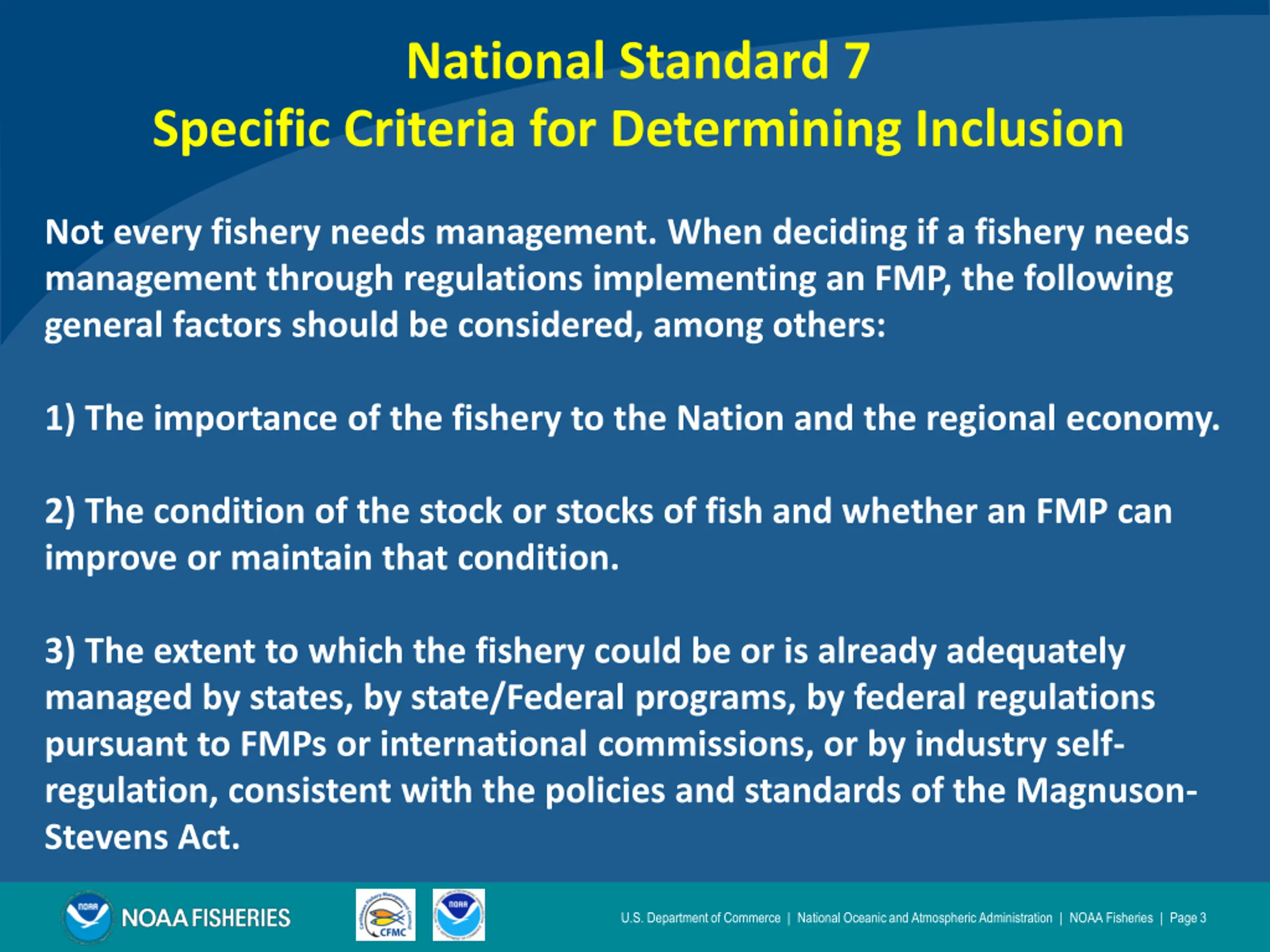 National Standard 7 Specific Criteria for Determining Inclusion Not every fishery needs management. When deciding if a fishery needs management through regulations implementing an FMP, the following general factors should be considered, among others: 1) The importance of the fishery to the Nation and the regional economy. 2) The condition of the stock or stocks of fish and whether an FMP can improve or maintain that condition. 3) The extent to which the fishery could be or is already adequately managed by states, by state/Federal programs, by federal regulations pursuant to FMPs or international commissions, or by industry self- regulation, consistent with the policies and standards of the Magnuson- Stevens Act. U.S. Department of Commerce | National Oceanic and Atmospheric Administration | NOAA Fisheries | Page 3