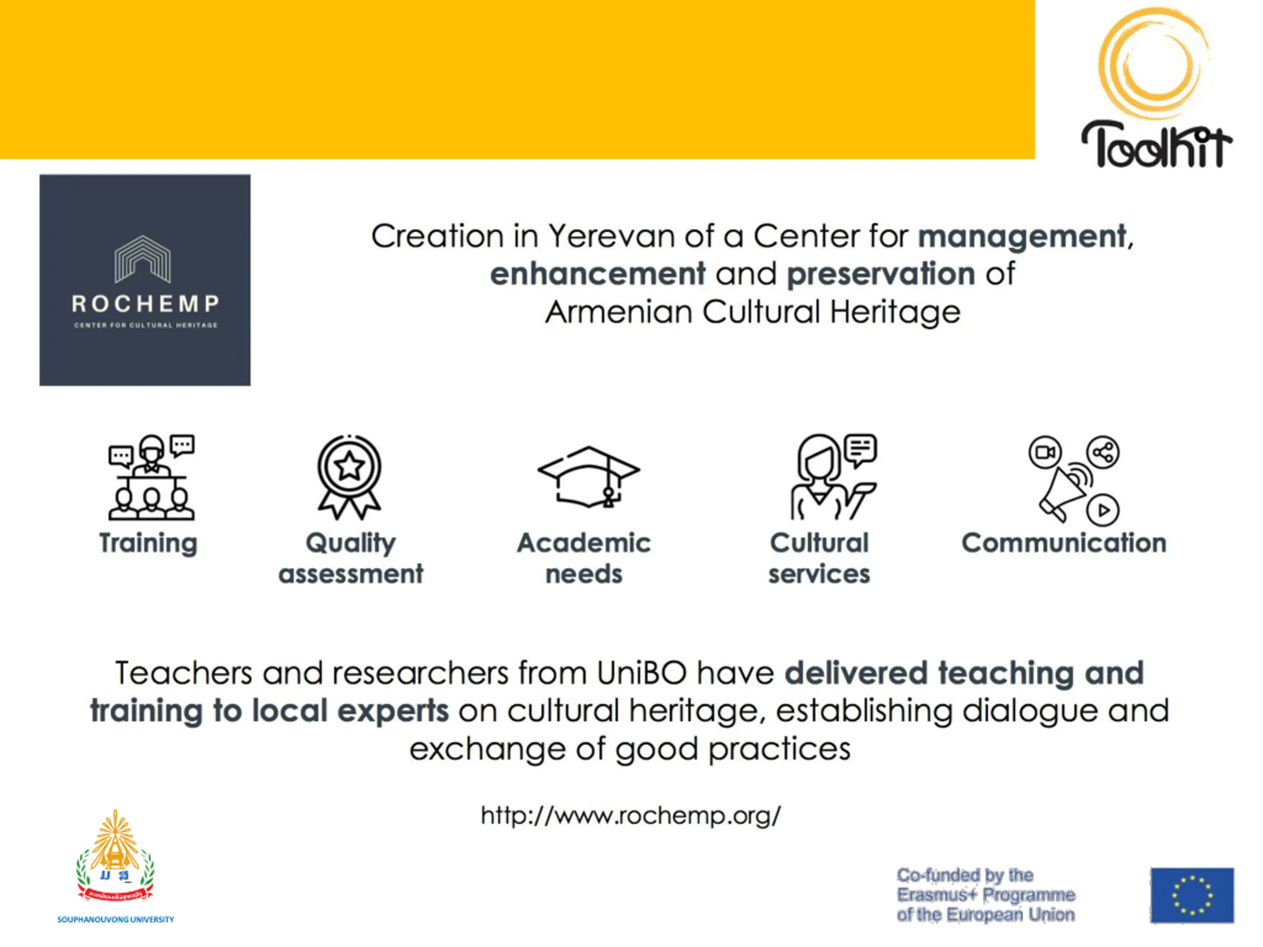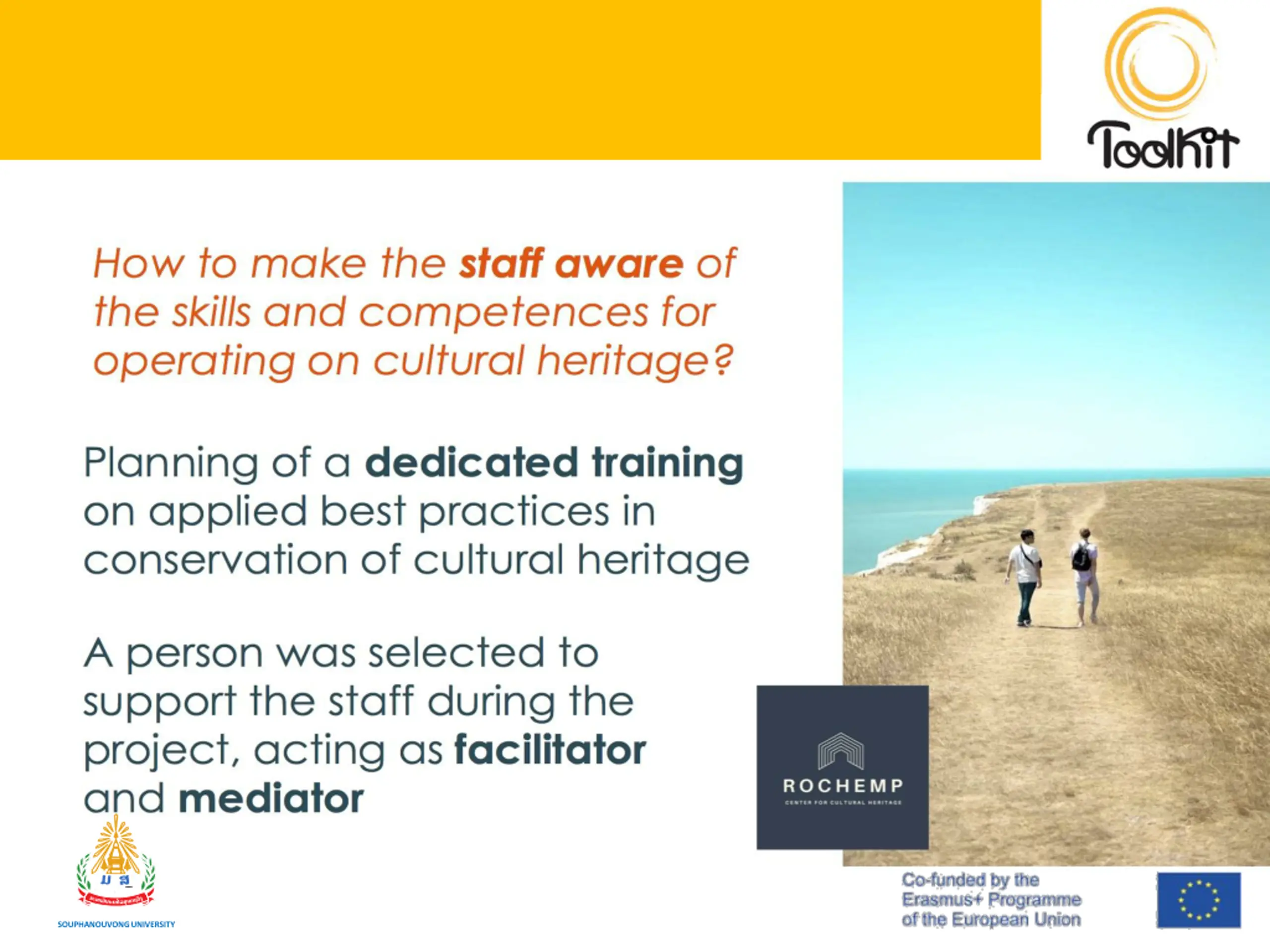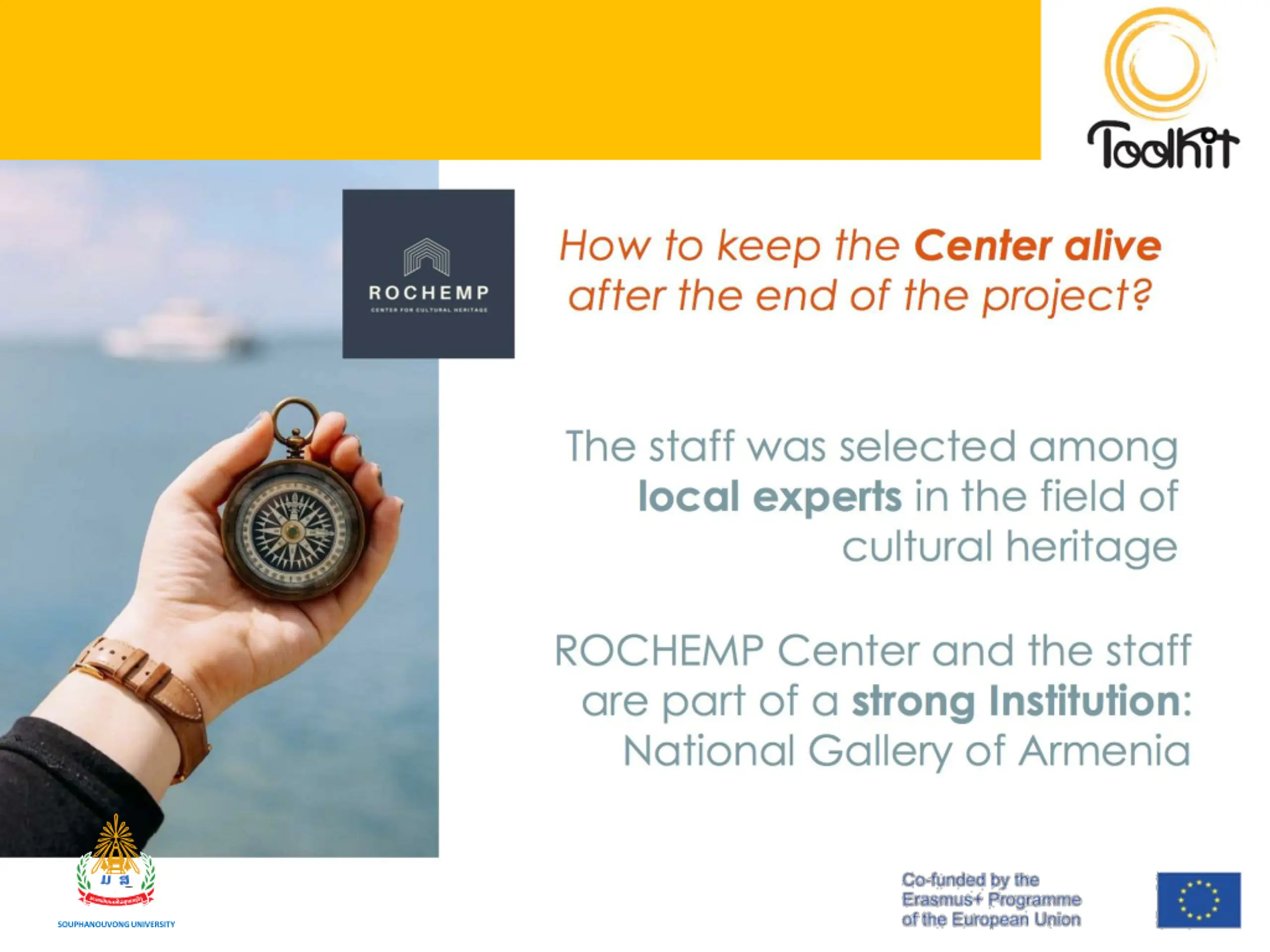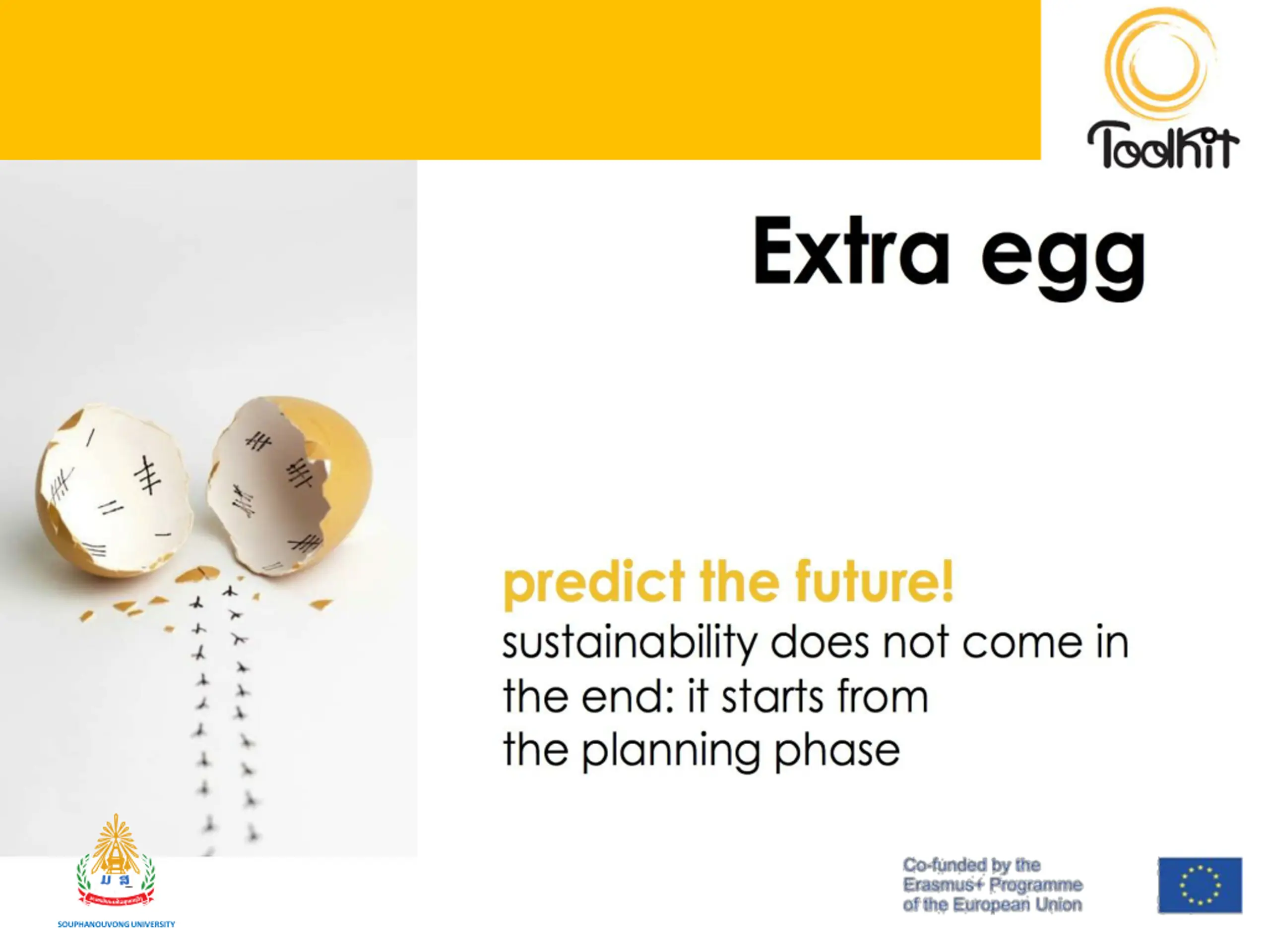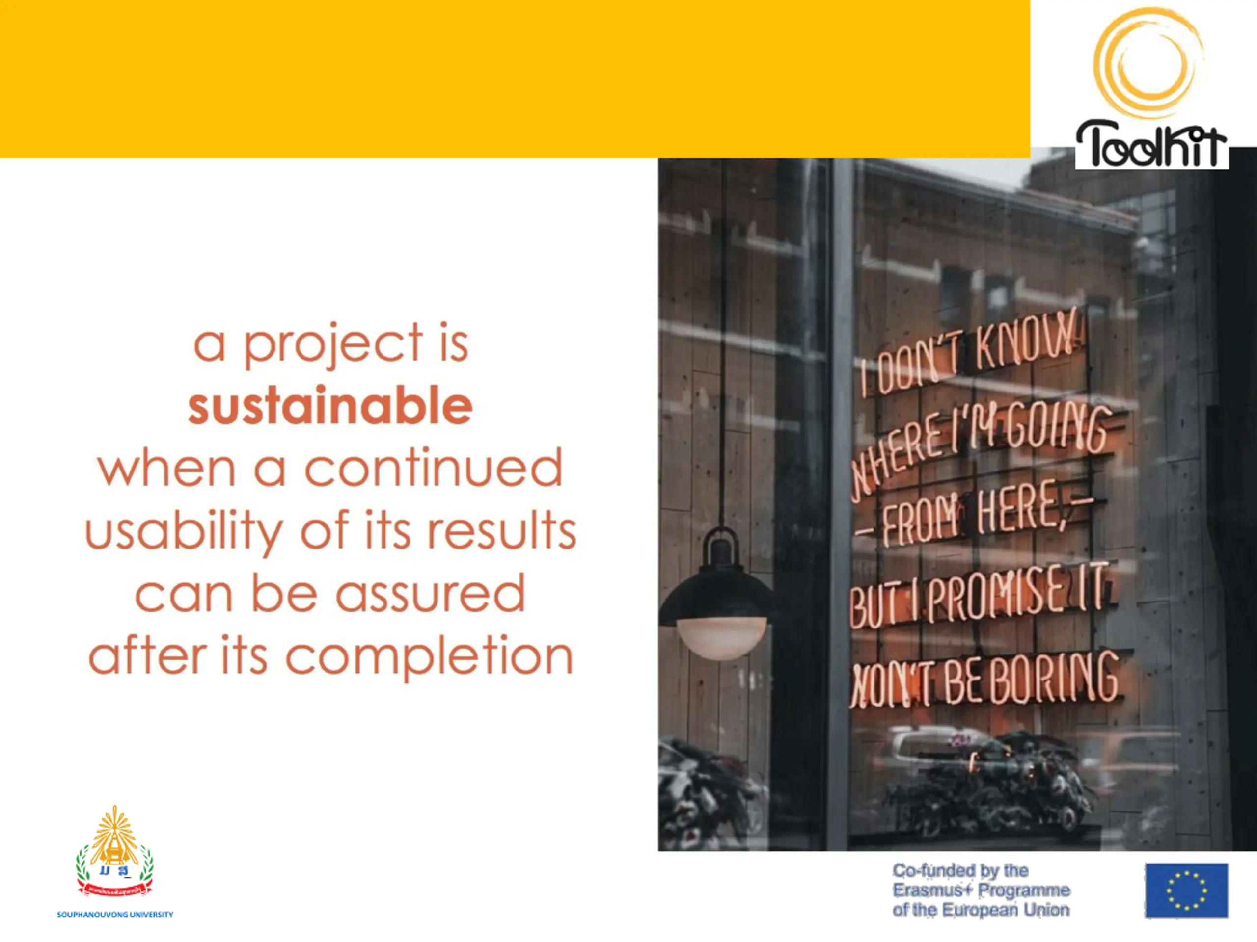 Tips for Sustainability Feet on the ground: relate the project to the pre-existing context, to avoid unsustainable actions Do not ear: LISTEN!: projects are made by people. Their socio-cultural background matters Make it count: a project is sustainable if all partners know how and why it matters Mind the gaps: they can set the basis for a project to be! SOUPHANOUVONG UNIVERSITY