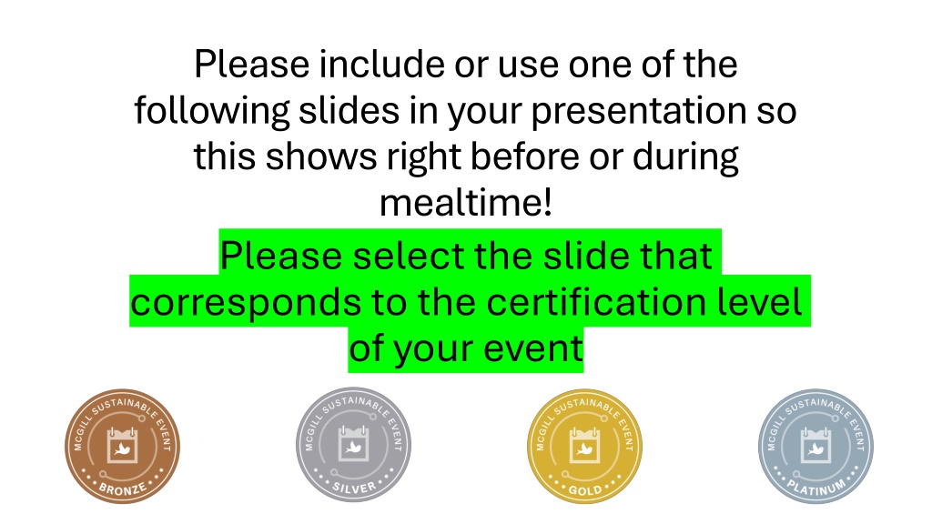 Please include or use one of the following slides in your presentation so this shows right before or during mealtime! Please select the slide that corresponds to the certification level of your event
