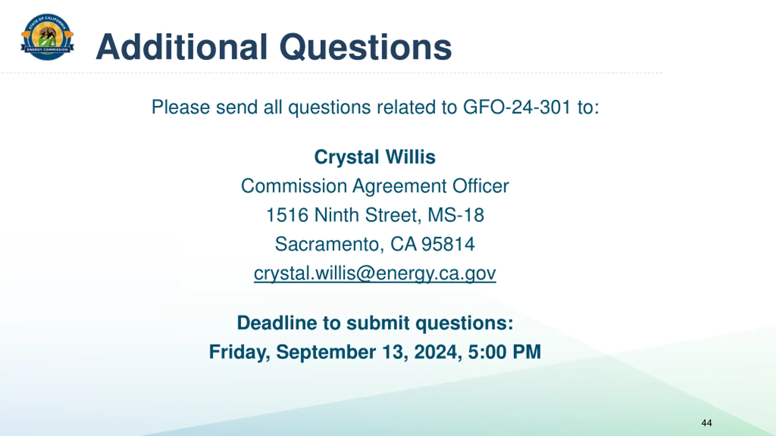 Additional Questions Please send all questions related to GFO-24-301 to: Crystal Willis Commission Agreement Officer 1516 Ninth Street, MS-18 Sacramento, CA 95814 crystal.willis@energy.ca.gov Deadline to submit questions: Friday, September 13, 2024, 5:00 PM 44