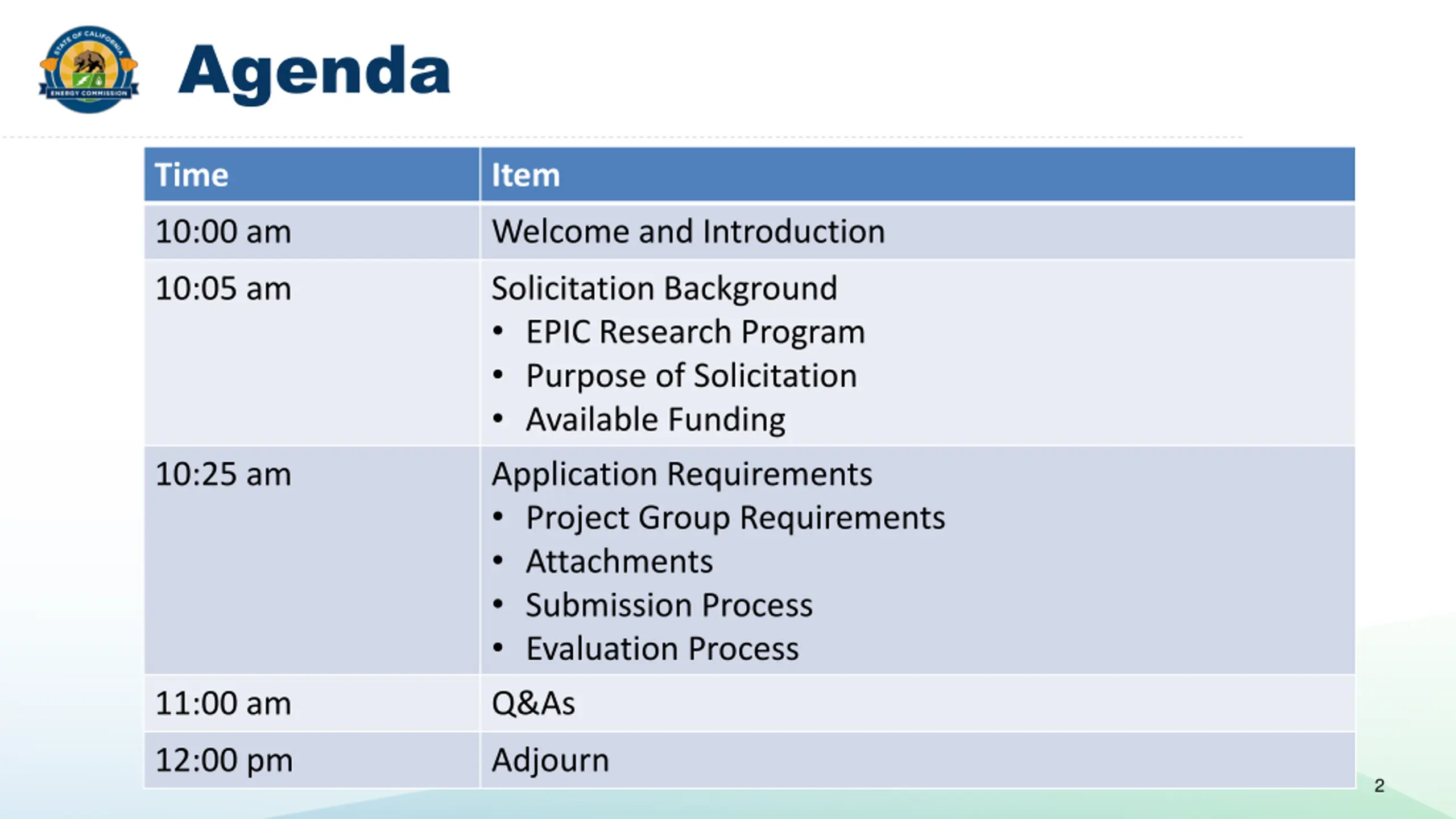 Agenda Time Item 10:00 am Welcome and Introduction 10:05 am Solicitation Background EPIC Research Program Purpose of Solicitation Available Funding Application Requirements Project Group Requirements Attachments Submission Process Evaluation Process 10:25 am 11:00 am Q&As 12:00 pm Adjourn 2