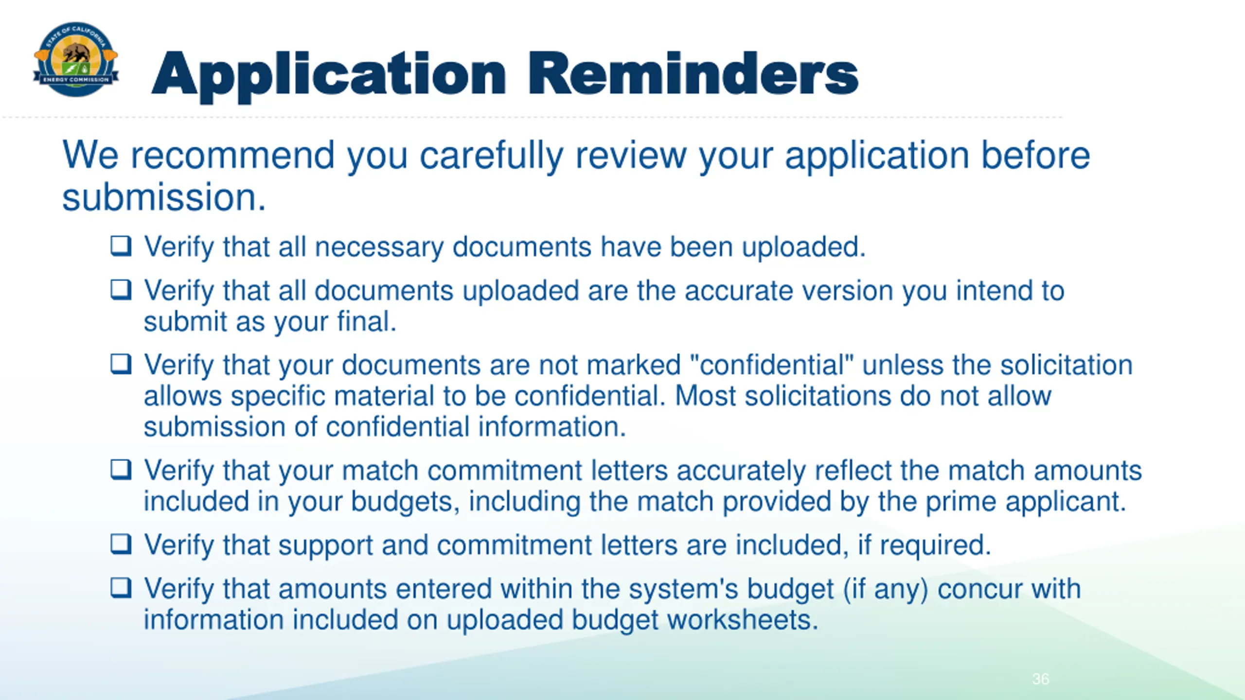 Application Reminders Application Reminders We recommend you carefully review your application before submission. Verify that all necessary documents have been uploaded. Verify that all documents uploaded are the accurate version you intend to submit as your final. Verify that your documents are not marked "confidential" unless the solicitation allows specific material to be confidential. Most solicitations do not allow submission of confidential information. Verify that your match commitment letters accurately reflect the match amounts included in your budgets, including the match provided by the prime applicant. Verify that support and commitment letters are included, if required. Verify that amounts entered within the system's budget (if any) concur with information included on uploaded budget worksheets. 36