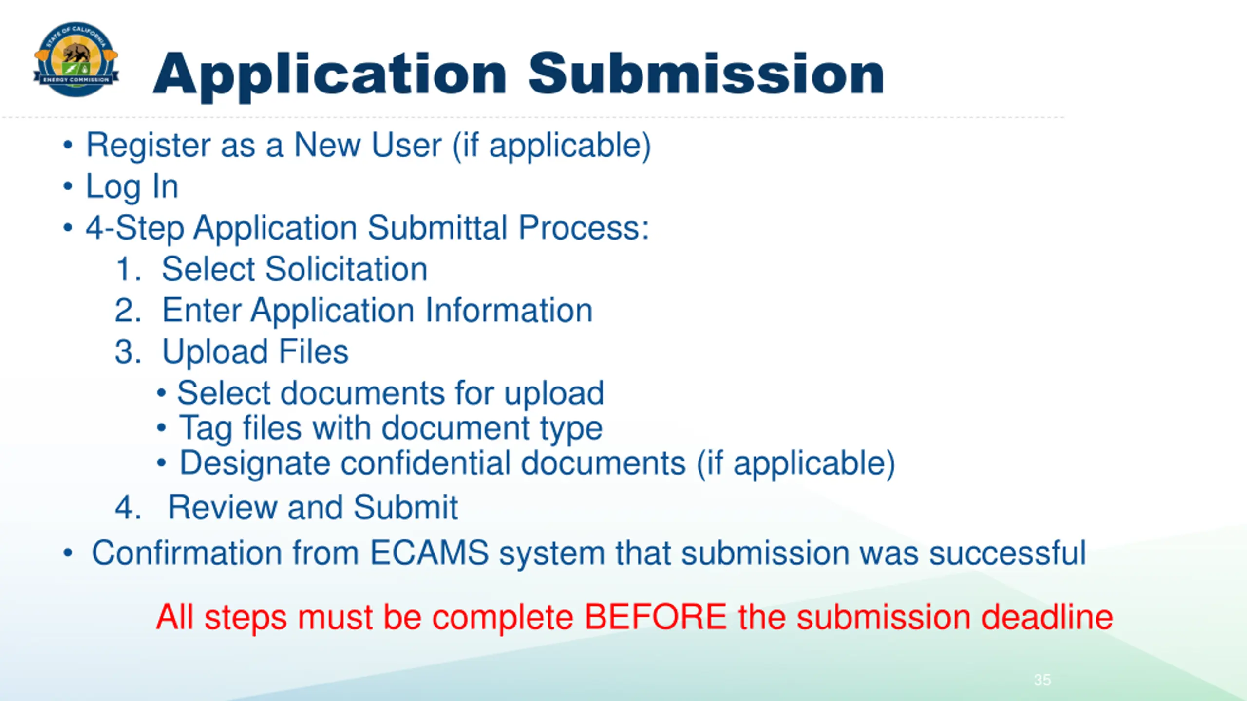 Submission Warning START THE PROCESS EARLY! Applications must be fully submitted BEFORE the deadline listed in the solicitation manual. The ECAMS system will reject applications submitted after the deadline. Applications in the process of being submitted prior to the deadline will NOT be accepted after the deadline. ECAMS support is ONLYavailable from 8am 5pm Monday-Friday. 34