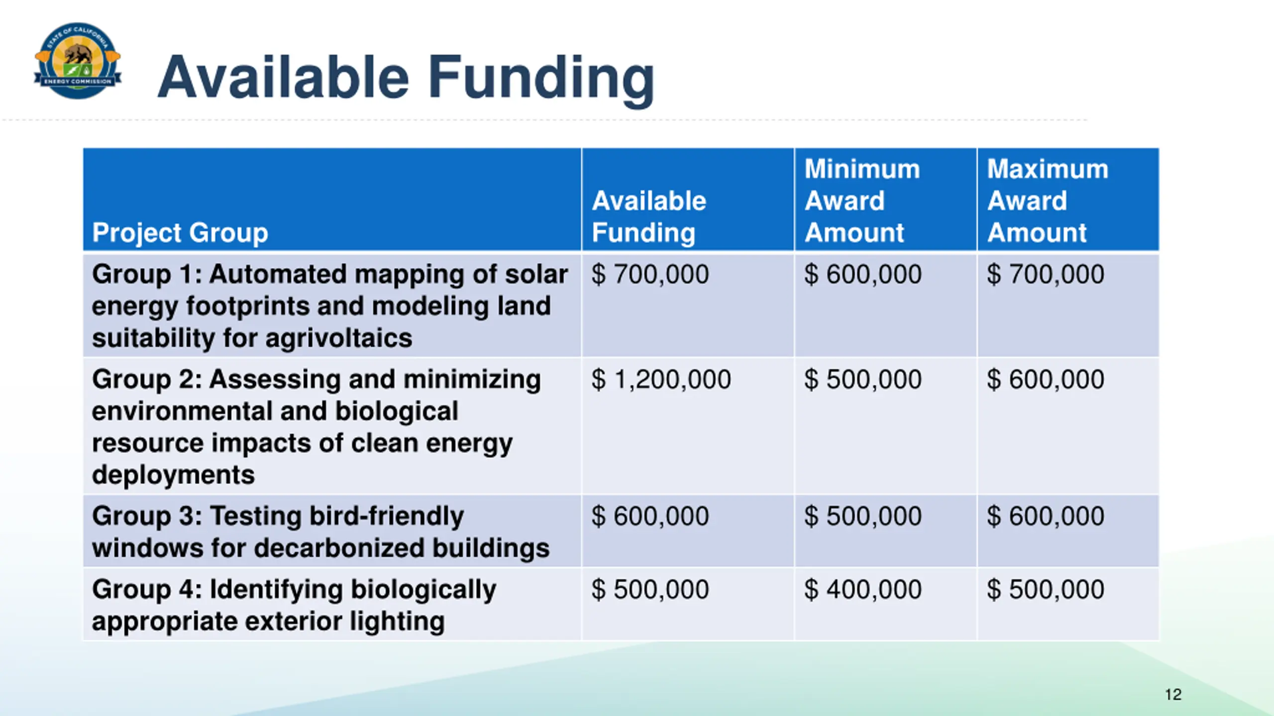Available Funding Minimum Award Amount $ 600,000 Maximum Award Amount $ 700,000 Available Funding $ 700,000 Project Group Group 1: Automated mapping of solar energy footprints and modeling land suitability for agrivoltaics Group 2: Assessing and minimizing environmental and biological resource impacts of clean energy deployments Group 3: Testing bird-friendly windows for decarbonized buildings Group 4: Identifying biologically appropriate exterior lighting $ 1,200,000 $ 500,000 $ 600,000 $ 600,000 $ 500,000 $ 600,000 $ 500,000 $ 400,000 $ 500,000 12