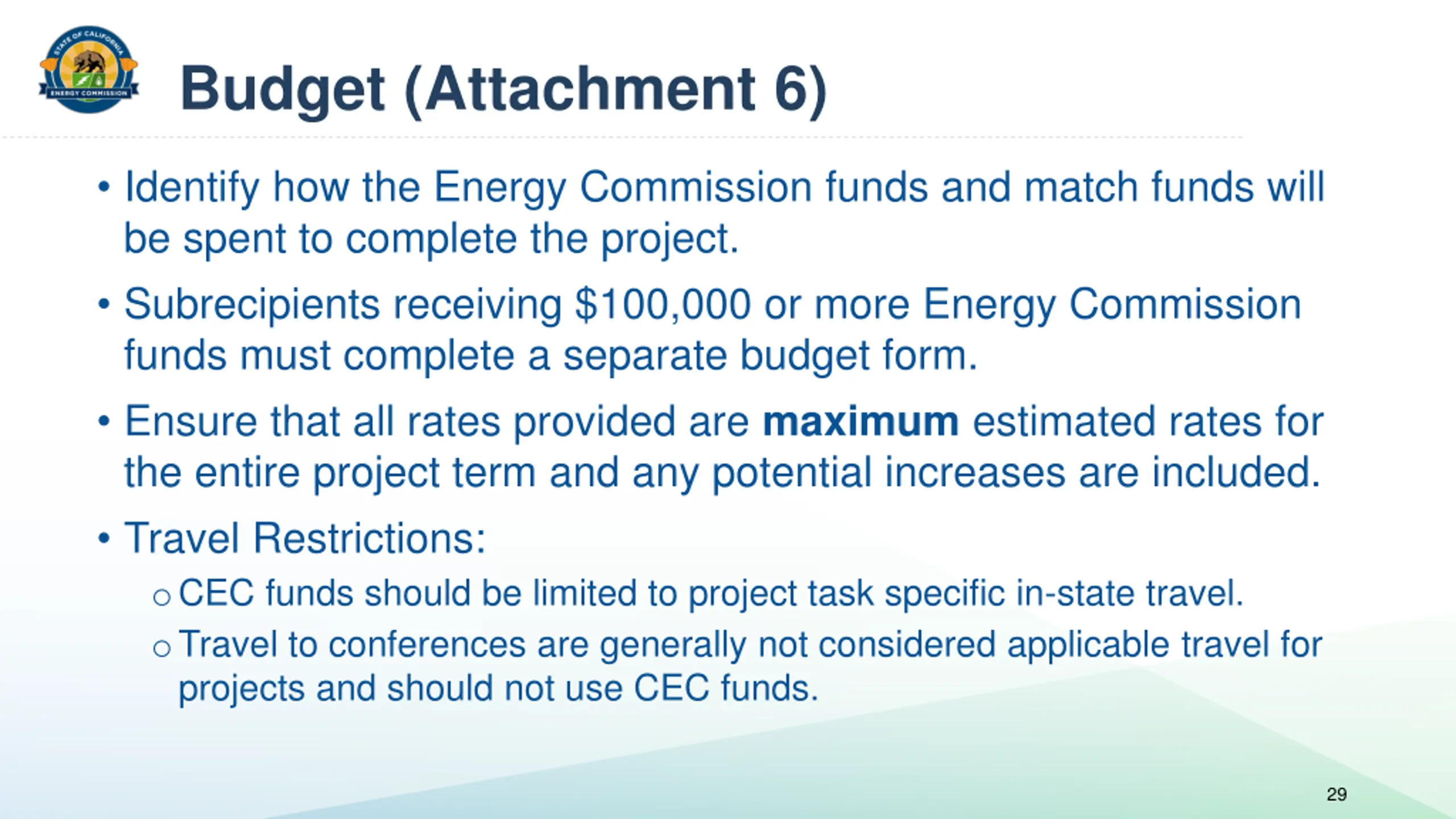 Budget (Attachment 6) Identify how the Energy Commission funds and match funds will be spent to complete the project. Subrecipients receiving $100,000 or more Energy Commission funds must complete a separate budget form. Ensure that all rates provided are maximum estimated rates for the entire project term and any potential increases are included. Travel Restrictions: oCEC funds should be limited to project task specific in-state travel. oTravel to conferences are generally not considered applicable travel for projects and should not use CEC funds. 29