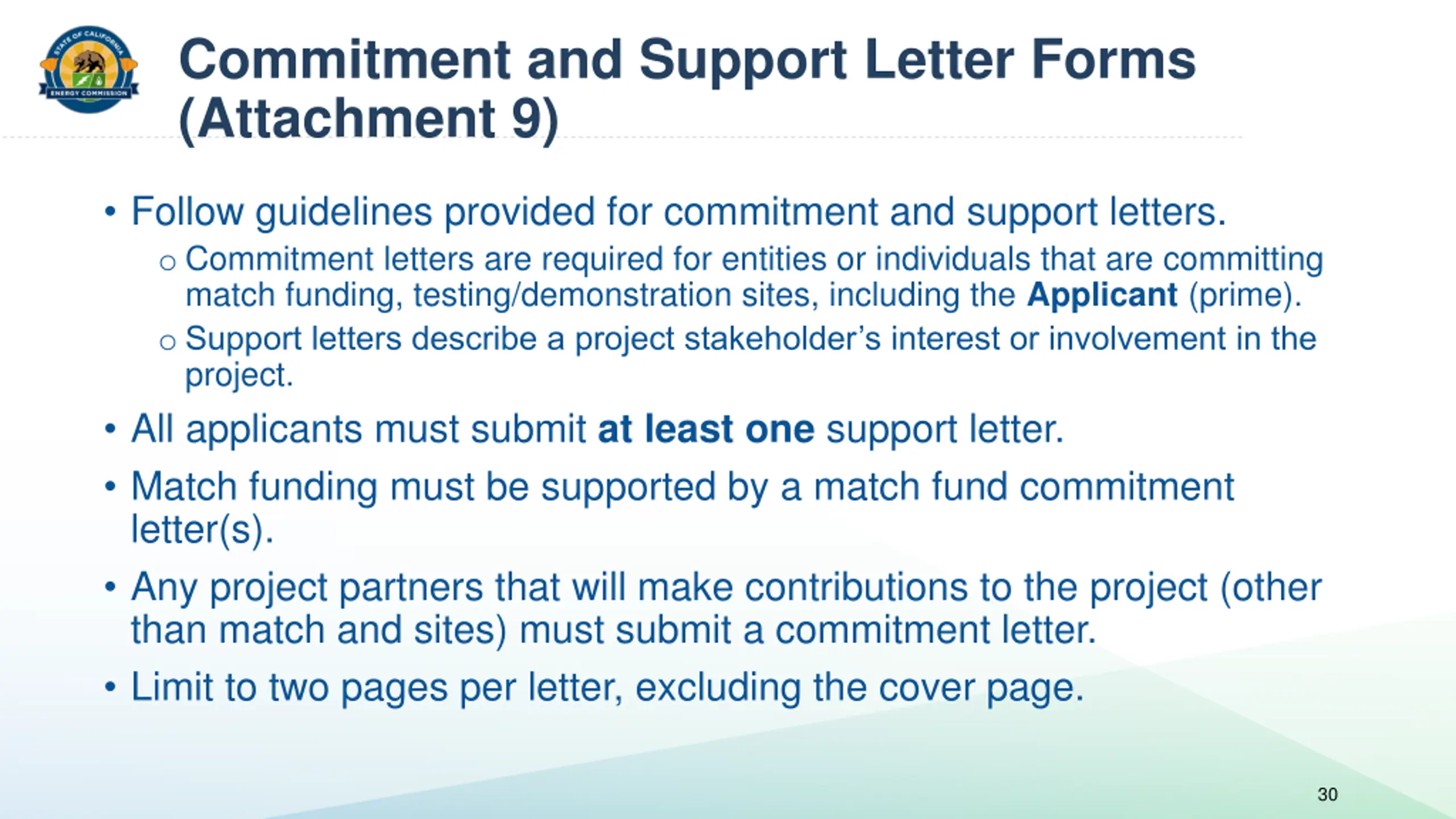 Commitment and Support Letter Forms (Attachment 9) Follow guidelines provided for commitment and support letters. o Commitment letters are required for entities or individuals that are committing match funding, testing/demonstration sites, including the Applicant (prime). o Support letters describe a project stakeholder s interest or involvement in the project. All applicants must submit at least one support letter. Match funding must be supported by a match fund commitment letter(s). Any project partners that will make contributions to the project (other than match and sites) must submit a commitment letter. Limit to two pages per letter, excluding the cover page. 30