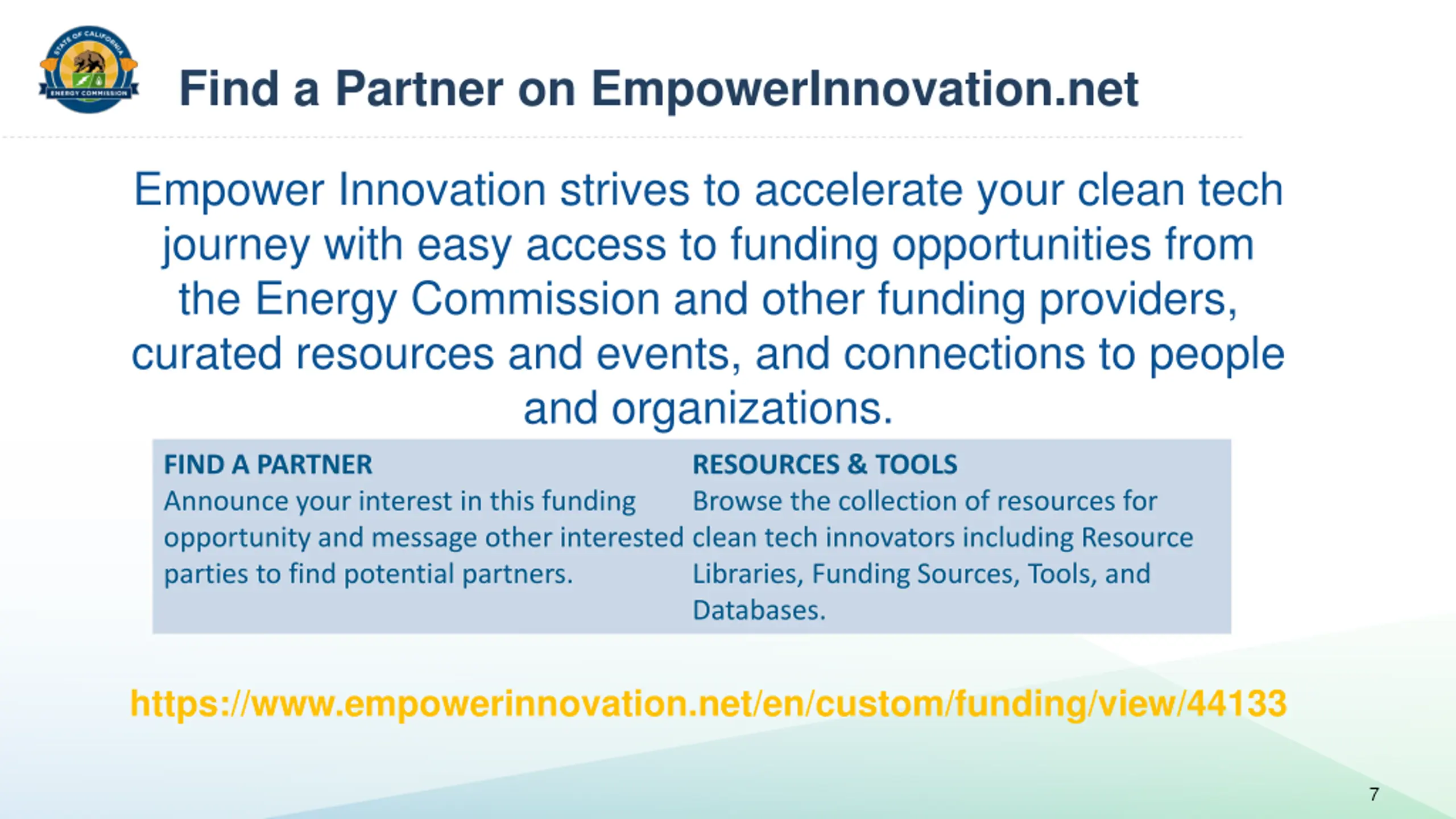 Find a Partner on EmpowerInnovation.net Empower Innovation strives to accelerate your clean tech journey with easy access to funding opportunities from the Energy Commission and other funding providers, curated resources and events, and connections to people and organizations. FIND A PARTNER Announce your interest in this funding opportunity and message other interested parties to find potential partners. RESOURCES & TOOLS Browse the collection of resources for clean tech innovators including Resource Libraries, Funding Sources, Tools, and Databases. https://www.empowerinnovation.net/en/custom/funding/view/44133 7