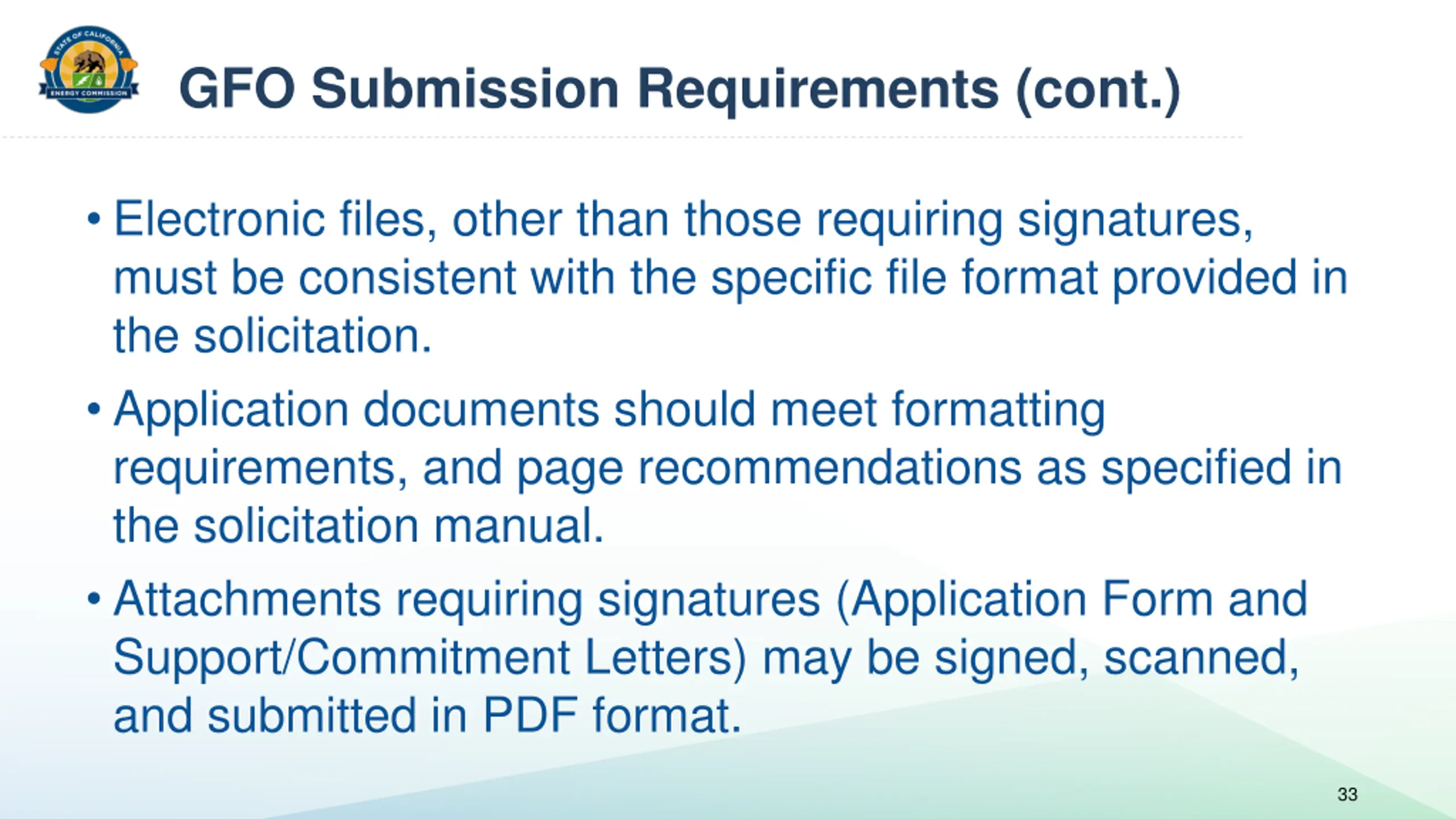 GFO Submission Requirements (cont.) For detailed instructions on application submittal, please see the Applying for a Solicitation at: https://www.energy.ca.gov/media/7956 Both referenced guidance documents are available at: https://www.energy.ca.gov/funding- opportunities/funding- resources under General Funding Information. Questions with the ECAMS system should be directed to: ECAMS.SalesforceSupport@Energy.ca.gov 32