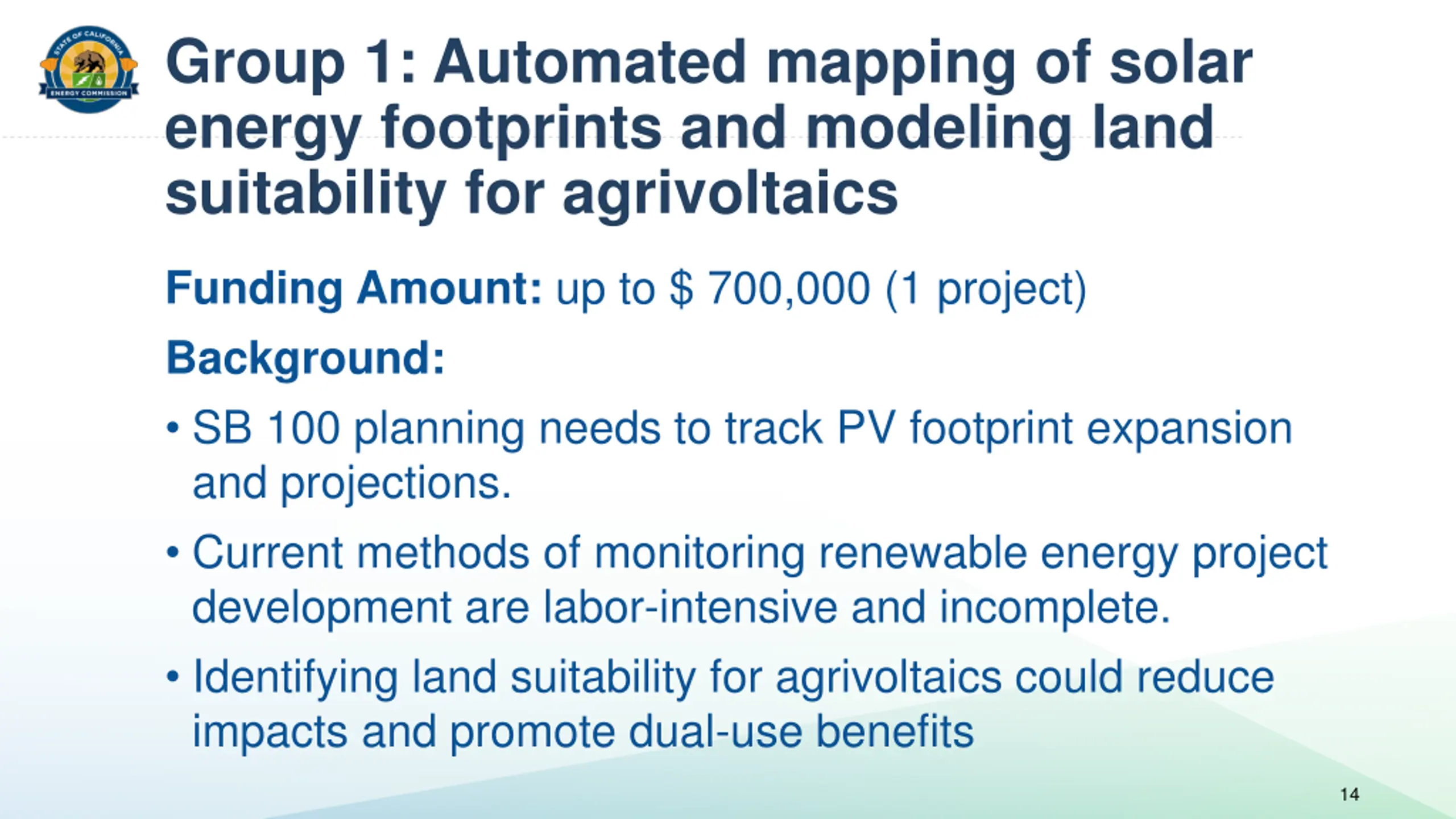 Group 1: Automated mapping of solar energy footprints and modeling land suitability for agrivoltaics Funding Amount: up to$ 700,000 (1 project) Background: SB 100 planning needs to track PV footprint expansion and projections. Current methods of monitoring renewable energy project development are labor-intensive and incomplete. Identifying land suitability for agrivoltaics could reduce impacts and promote dual-use benefits 14