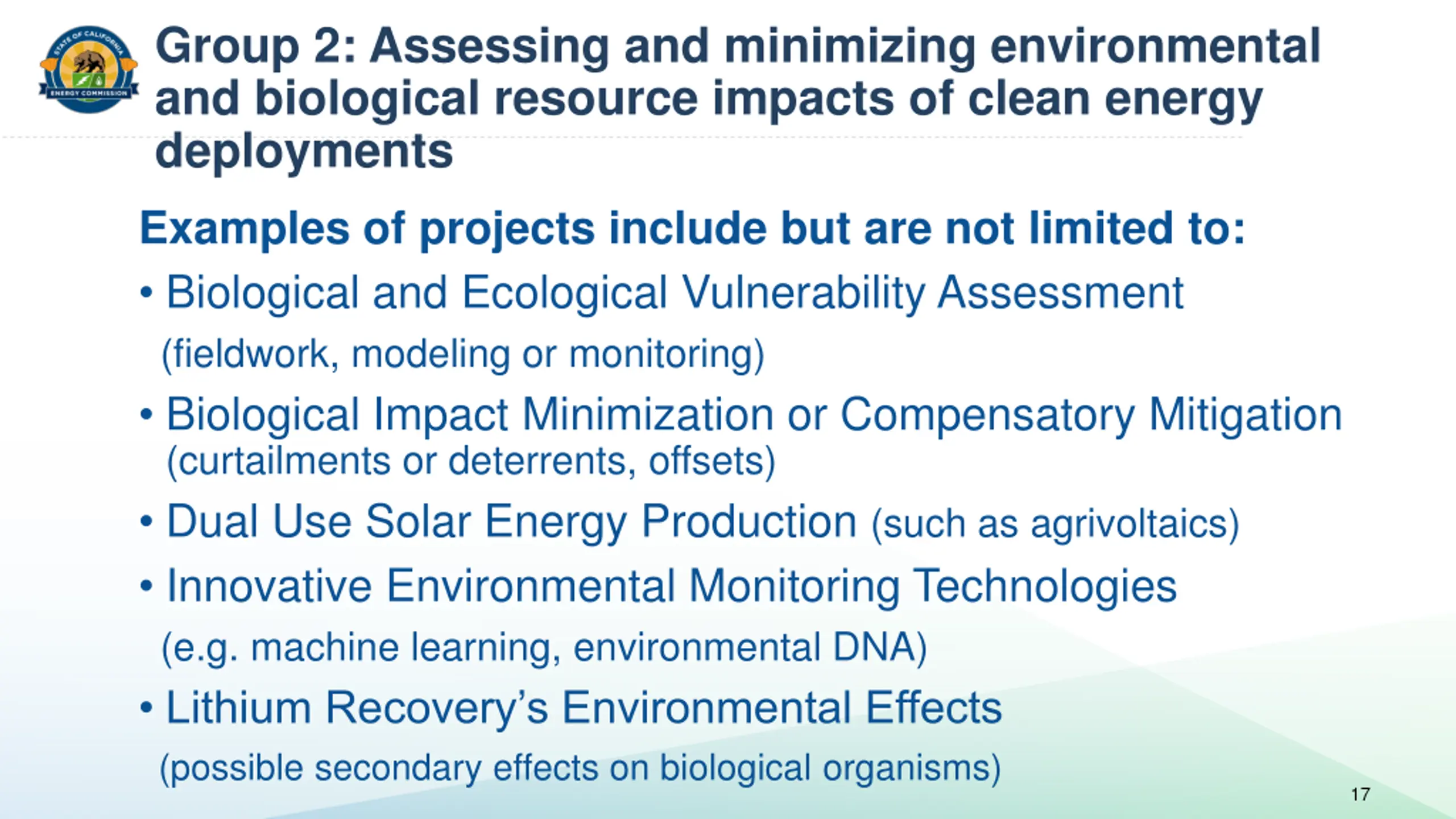 Group 2: Assessing and minimizing environmental and biological resource impacts of clean energy deployments Examples of projects include but are not limited to: Biological and Ecological Vulnerability Assessment (fieldwork, modeling or monitoring) Biological Impact Minimization or Compensatory Mitigation (curtailments or deterrents, offsets) Dual Use Solar Energy Production (such as agrivoltaics) Innovative Environmental Monitoring Technologies (e.g. machine learning, environmental DNA) Lithium Recovery s Environmental Effects (possible secondary effects on biological organisms) 17