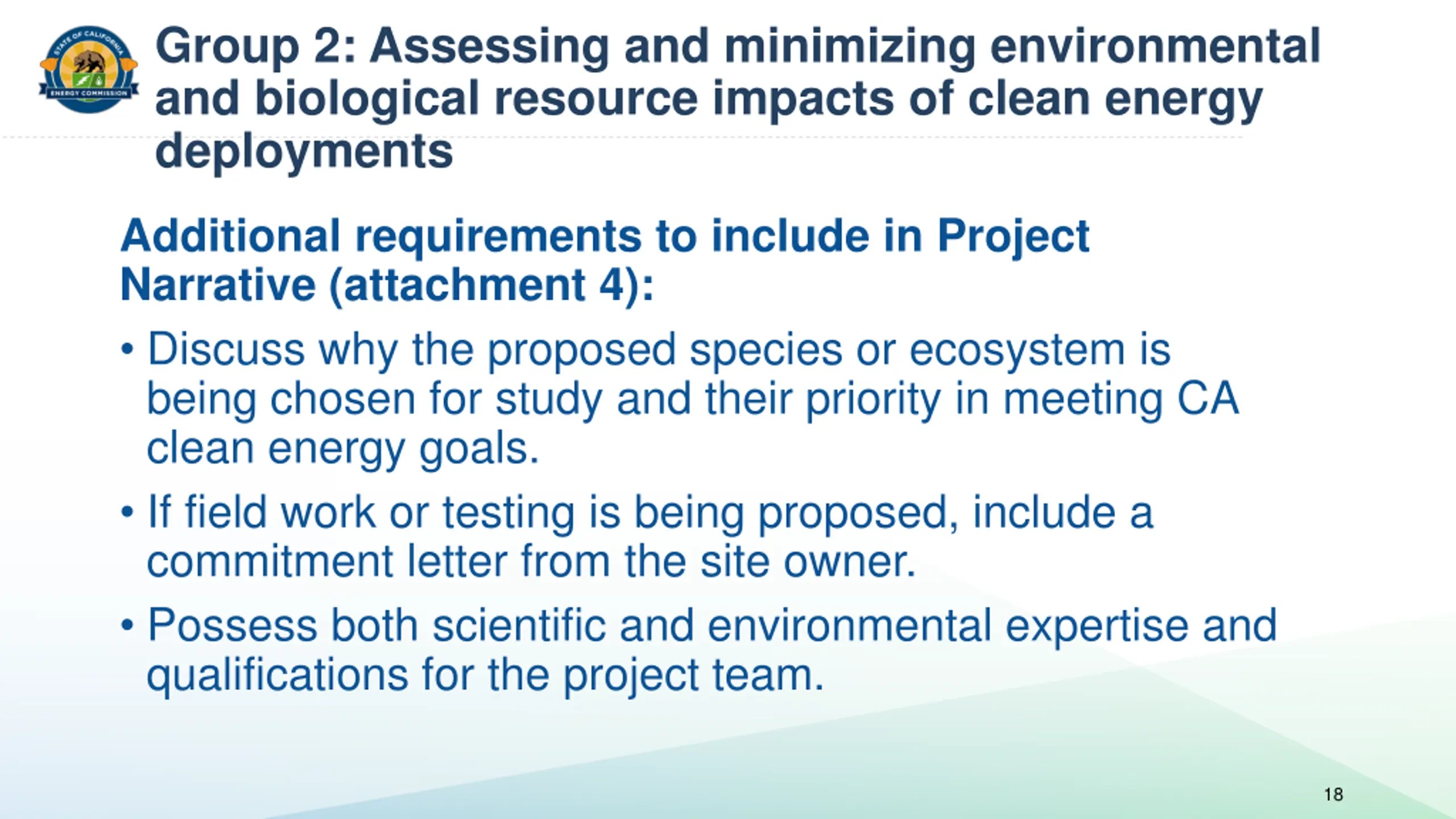 Group 2: Assessing and minimizing environmental and biological resource impacts of clean energy deployments Additional requirements to include in Project Narrative (attachment 4): Discuss why the proposed species or ecosystem is being chosen for study and their priority in meeting CA clean energy goals. If field work or testing is being proposed, include a commitment letter from the site owner. Possess both scientific and environmental expertise and qualifications for the project team. 18