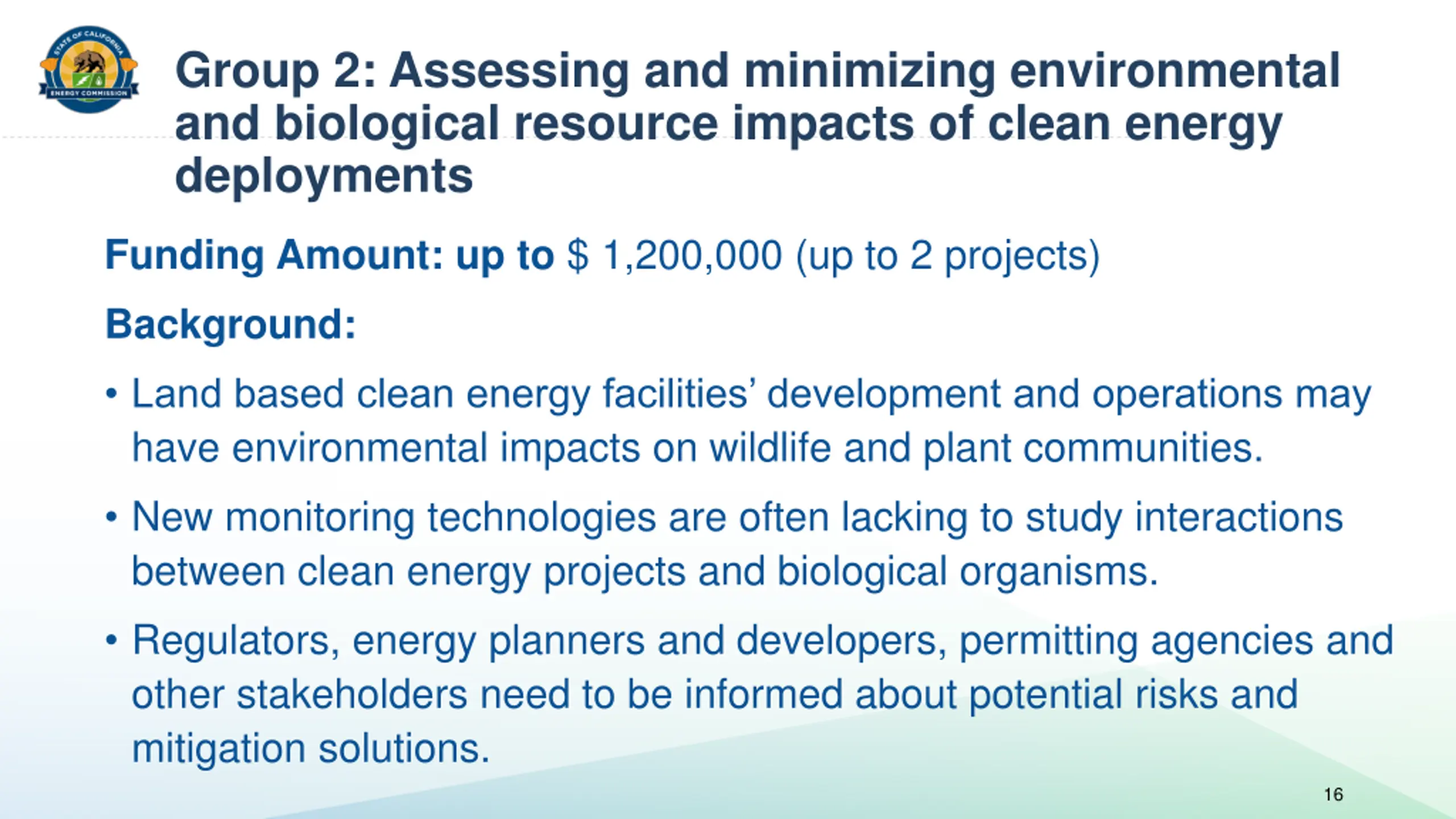 Group 2: Assessing and minimizing environmental and biological resource impacts of clean energy deployments Funding Amount: up to $ 1,200,000 (up to 2 projects) Background: Land based clean energy facilities development and operations may have environmental impacts on wildlife and plant communities. New monitoring technologies are often lacking to study interactions between clean energy projects and biological organisms. Regulators, energy planners and developers, permitting agencies and other stakeholders need to be informed about potential risks and mitigation solutions. 16