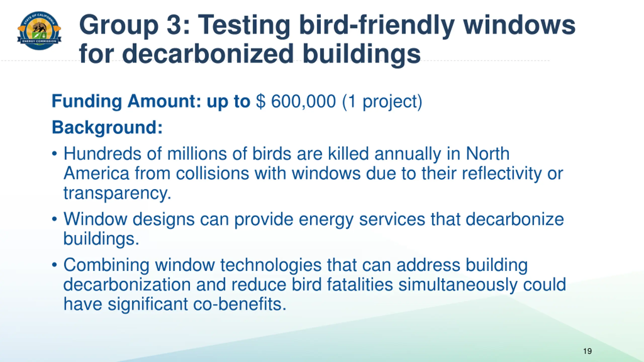 Group 3: Testing bird-friendly windows for decarbonized buildings Funding Amount: up to $ 600,000 (1 project) Background: Hundreds of millions of birds are killed annually in North America from collisions with windows due to their reflectivity or transparency. Window designs can provide energy services that decarbonize buildings. Combining window technologies that can address building decarbonization and reduce bird fatalities simultaneously could have significant co-benefits. 19