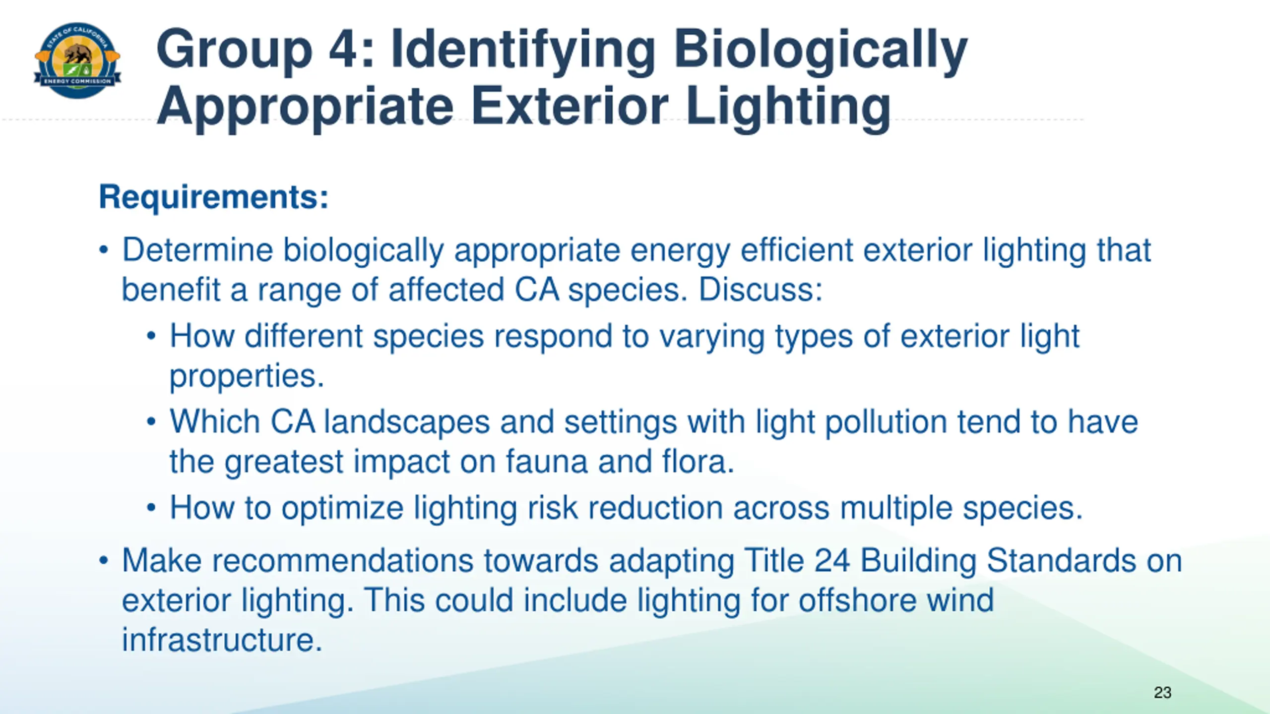 Group 4: Identifying Biologically Appropriate Exterior Lighting Requirements: Determine biologically appropriate energy efficient exterior lighting that benefit a range of affected CA species. Discuss: How different species respond to varying types of exterior light properties. Which CA landscapes and settings with light pollution tend to have the greatest impact on fauna and flora. How to optimize lighting risk reduction across multiple species. Make recommendations towards adapting Title 24 Building Standards on exterior lighting. This could include lighting for offshore wind infrastructure. 23
