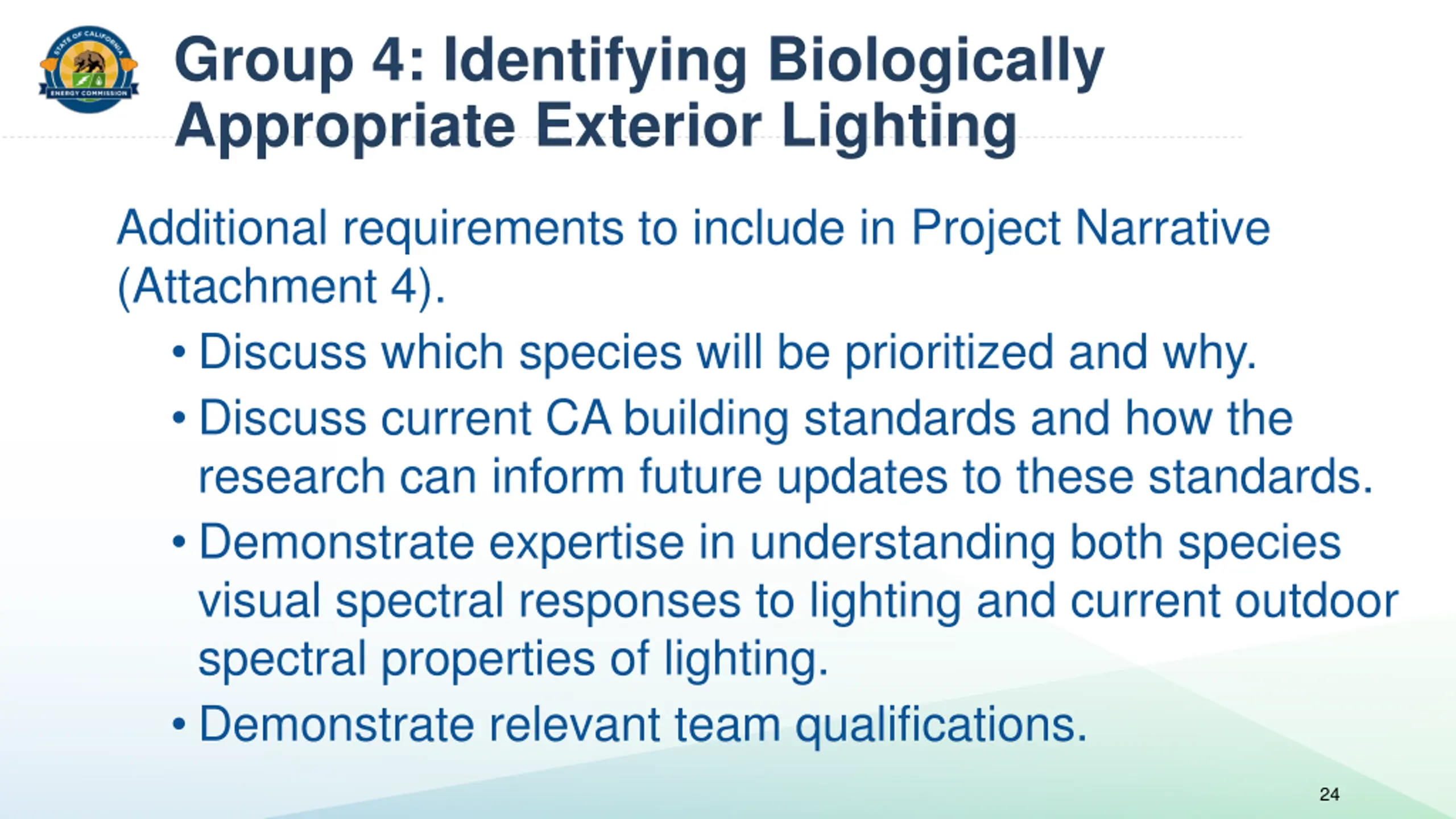 Group 4: Identifying Biologically Appropriate Exterior Lighting Additional requirements to include in Project Narrative (Attachment 4). Discuss which species will be prioritized and why. Discuss current CA building standards and how the research can inform future updates to these standards. Demonstrate expertise in understanding both species visual spectral responses to lighting and current outdoor spectral properties of lighting. Demonstrate relevant team qualifications. 24