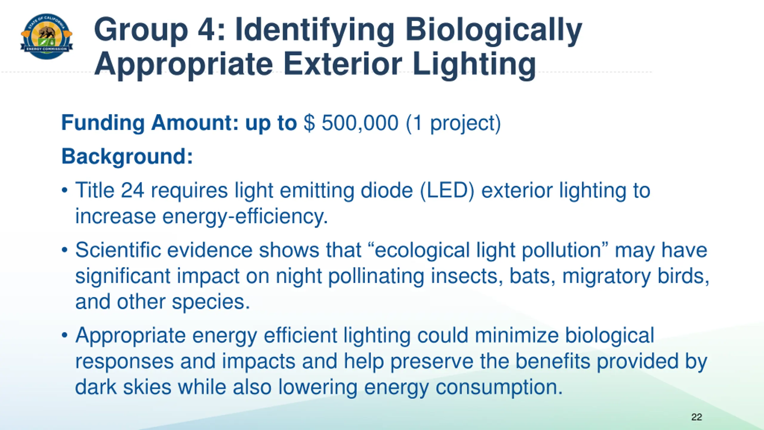 Group 4: Identifying Biologically Appropriate Exterior Lighting Funding Amount: up to $ 500,000 (1 project) Background: Title 24 requires light emitting diode (LED) exterior lighting to increase energy-efficiency. Scientific evidence shows that ecological light pollution may have significant impact on night pollinating insects, bats, migratory birds, and other species. Appropriate energy efficient lighting could minimize biological responses and impacts and help preserve the benefits provided by dark skies while also lowering energy consumption. 22