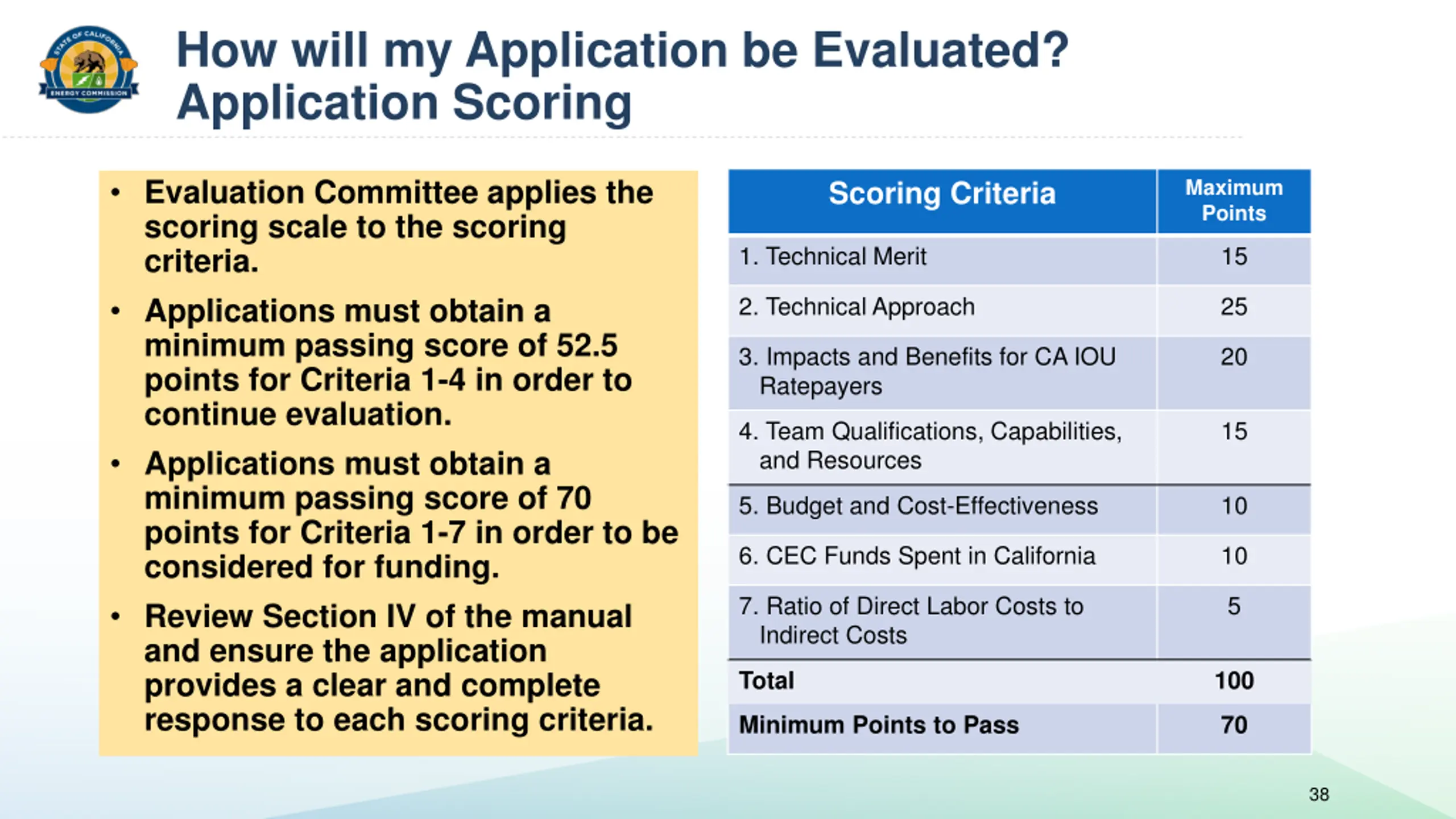 How will my Application be Evaluated? Application Scoring Evaluation Committee applies the scoring scale to the scoring criteria. Applications must obtain a minimum passing score of 52.5 points for Criteria 1-4 in order to continue evaluation. Applications must obtain a minimum passing score of 70 points for Criteria 1-7 in order to be considered for funding. Review Section IV of the manual and ensure the application provides a clear and complete response to each scoring criteria. Maximum Points Scoring Criteria 1. Technical Merit 15 2. Technical Approach 25 3. Impacts and Benefits for CA IOU Ratepayers 20 4. Team Qualifications, Capabilities, and Resources 15 5. Budget and Cost-Effectiveness 10 6. CEC Funds Spent in California 10 7. Ratio of Direct Labor Costs to Indirect Costs 5 Total 100 Minimum Points to Pass 70 38