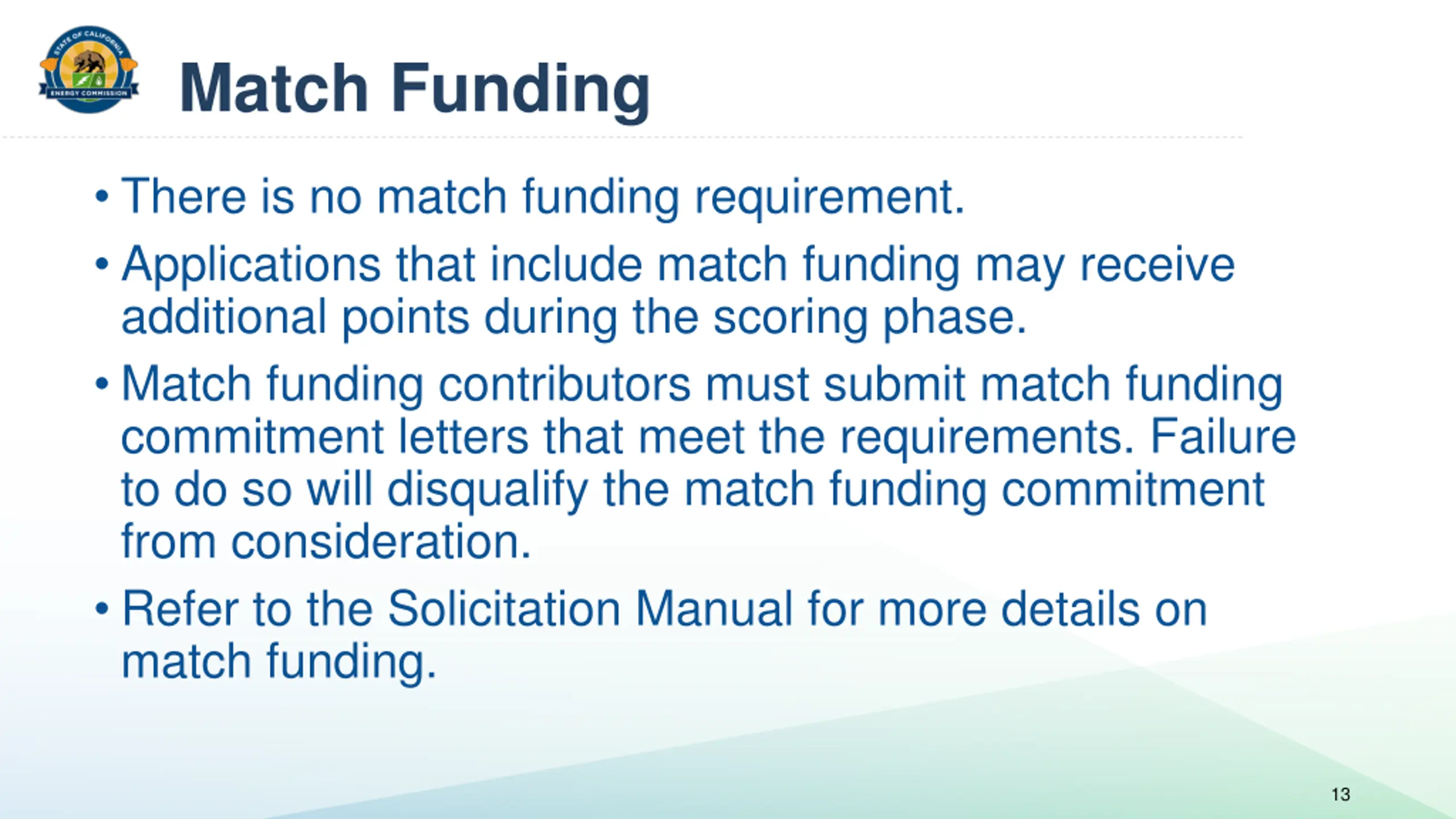 Match Funding There is no match funding requirement. Applications that include match funding may receive additional points during the scoring phase. Match funding contributors must submit match funding commitment letters that meet the requirements. Failure to do so will disqualify the match funding commitment from consideration. Refer to the Solicitation Manual for more details on match funding. 13