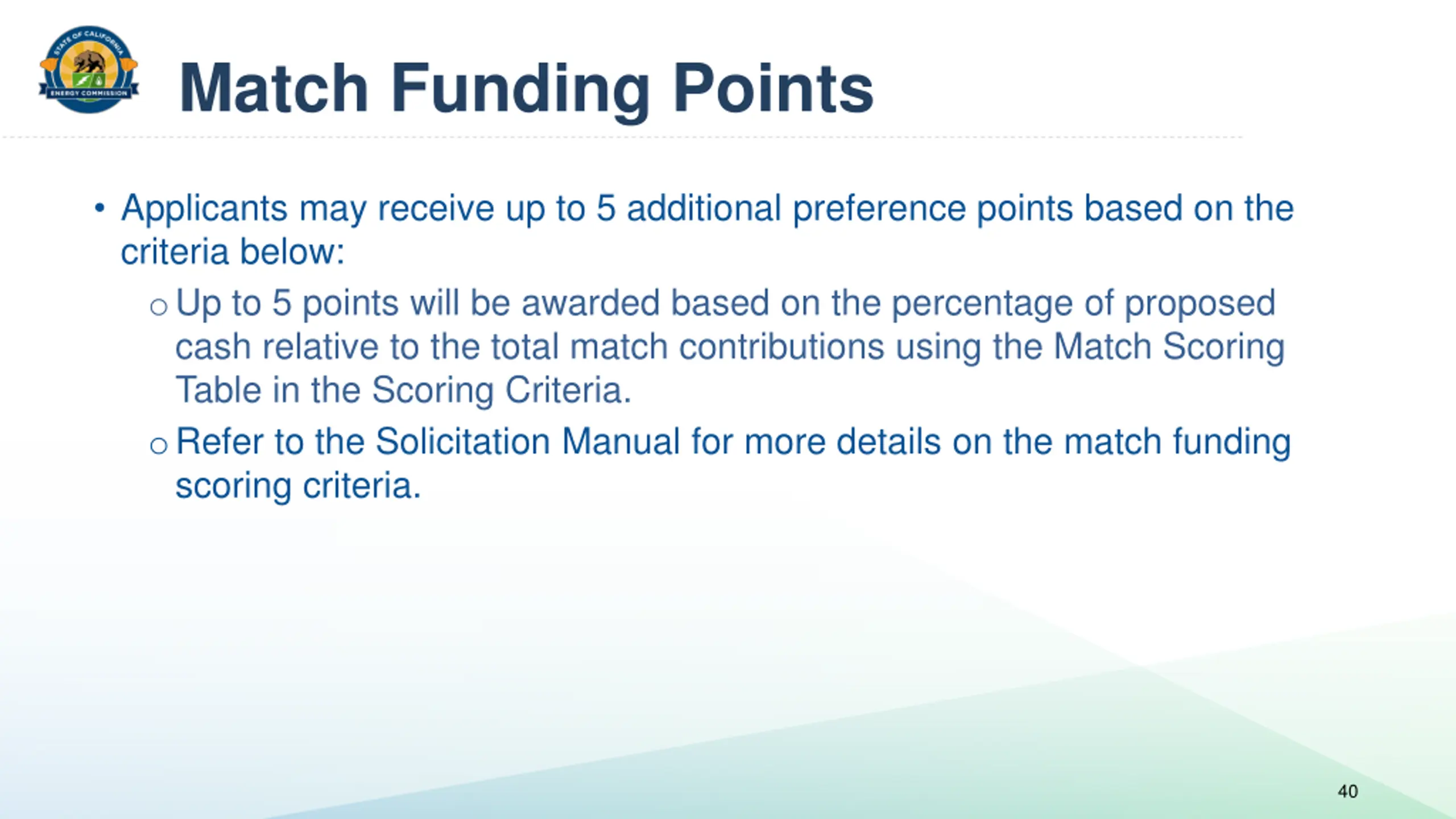 Match Funding Points Applicants may receive up to 5 additional preference points based on the criteria below: oUp to 5 points will be awarded based on the percentage of proposed cash relative to the total match contributions using the Match Scoring Table in the Scoring Criteria. oRefer to the Solicitation Manual for more details on the match funding scoring criteria. 40